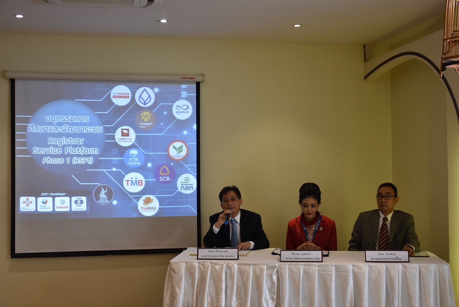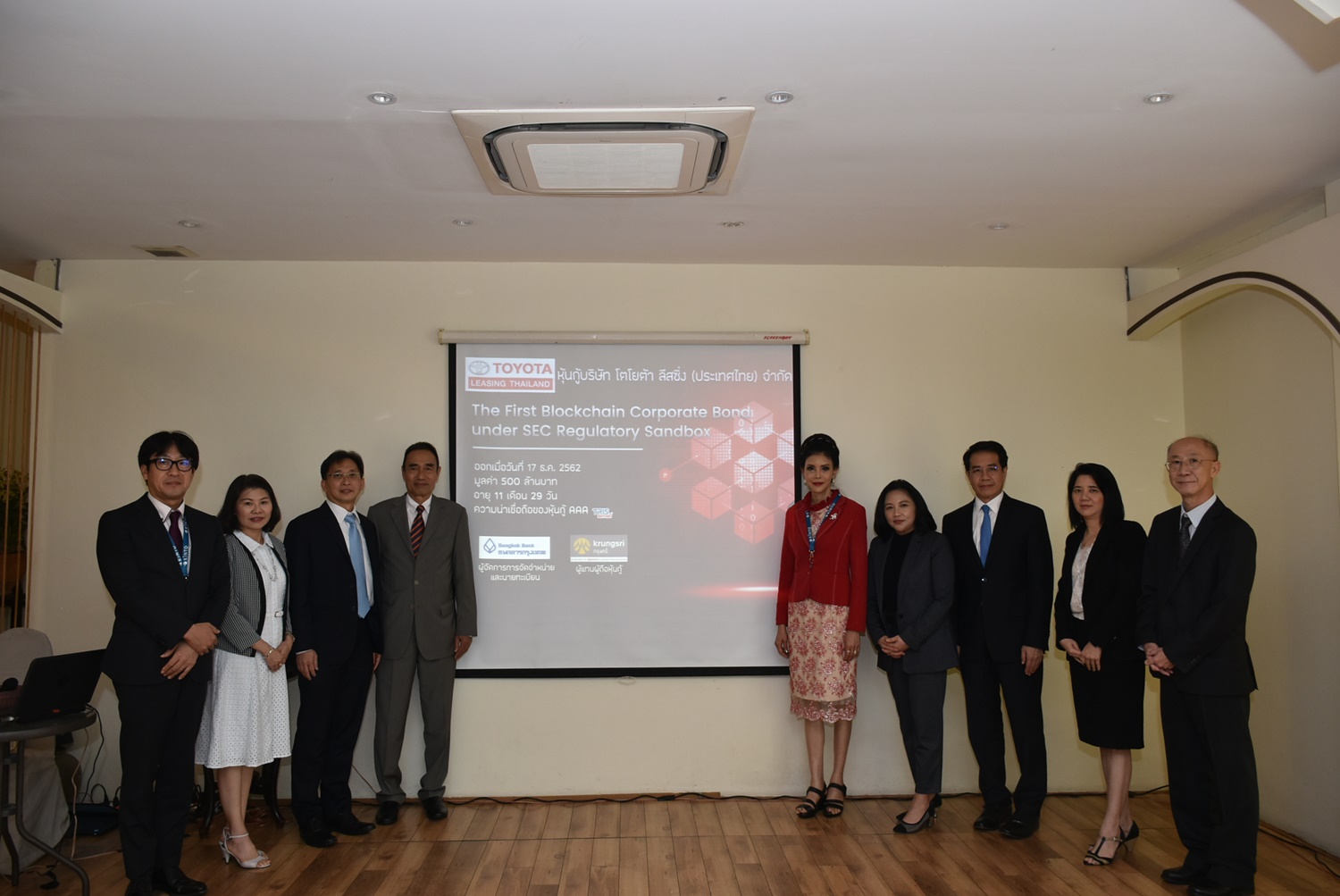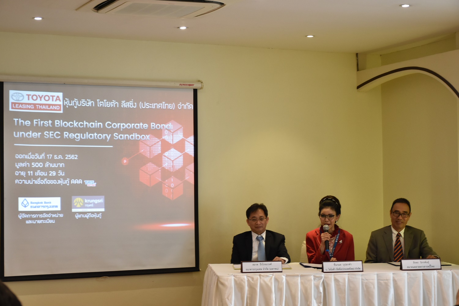 ThaiBMA Gallery ภาพบรรยากาศงานแถลงข่าว Thailand’s First Blockchain Corporate Bond under SEC Regulatory Sandbox ภาพบรรยากาศงานแถลงข่าว Thailand’s First Blockchain Corporate Bond under SEC Regulatory Sandbox โดยบริษัท โตโยต้า ลีสซิ่ง (ประเทศไทย) จำกัด เป็นบริษัทเอกชนรายแรกที่ออกและเสนอขายหุ้นกู้ด้วย Distributed Ledger Technology (DLT) หรือ Blockchain ภายใต้โครงการทดสอบและพัฒนานวัตกรรมเพื่อสนับสนุนการให้บริการเกี่ยวกับตลาดทุน หรือ Sandbox ของสำนักงาน ก.ล.ต. ได้สำเร็จเป็นครั้งแรกของประเทศไทย โดยมี คุณสอาด ธีรโรจนวงศ์ ผู้ช่วยผู้จัดการใหญ่ ฝ่ายค้าเงินตราต่างประเทศ สายบริหารการเงิน ธนาคาร กรุงเทพ – ประธานอนุกรรมการ Registrar Service Platform Phase I, คุณชื่นกมล บุปผาคำ กรรมการผู้จัดการใหญ่ บริษัท โตโยต้า ลีสซิ่ง (ประเทศไทย) จำกัด, คุณสิงหะ นิกรพันธ์ ประธานคณะกรรมการ สมาคมตลาดตราสารหนี้ไทย ร่วมงานแถลงข่าวดังกล่าว Back to Main Gallery