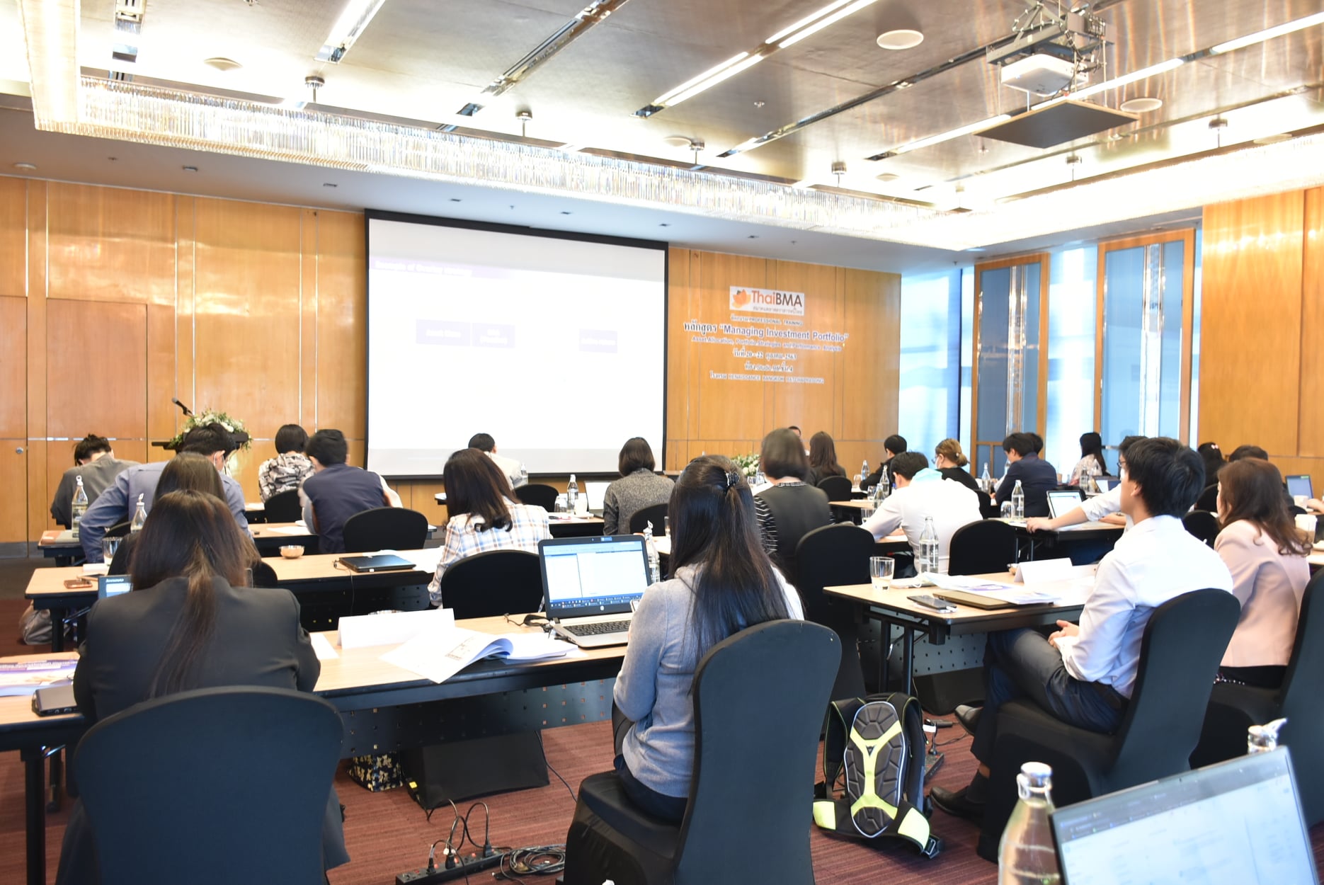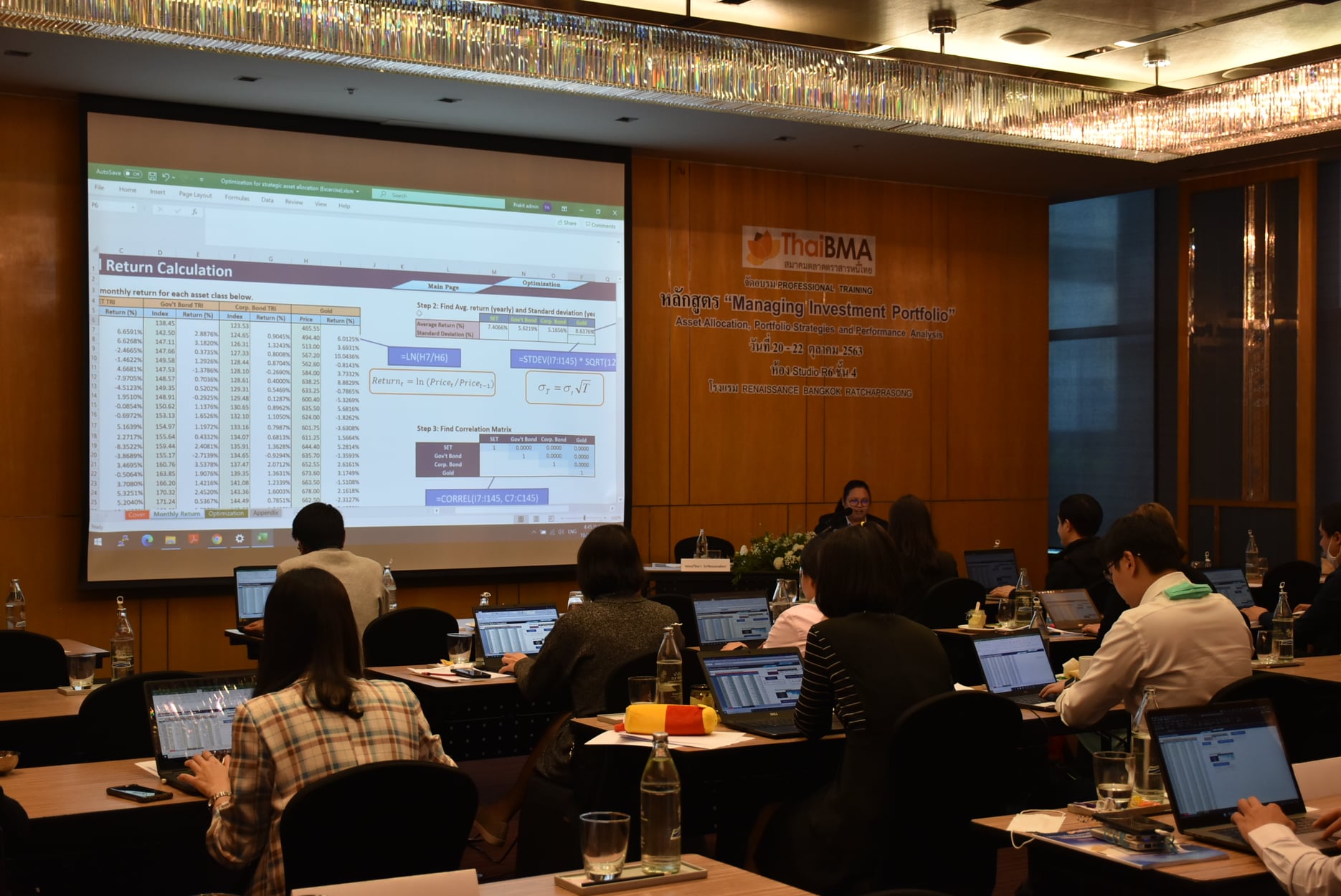 ThaiBMA Gallery หลักสูตรอบรม "Managing Investment Portfolio" ภาพบรรยากาศวันที่สามของการอบรม หลักสูตรอบรม "Managing Investment Portfolio" ในรูปแบบ Hybrid Classroom ซึ่งจัดขึ้นในวันที่ 22 ตุลาคม 2563 เวลา 09.00-17.15 น. ณ โรงแรมเรเนซองส์ กรุงเทพฯ ราชประสงค์ หัวข้ออบรมในวันนี้ ช่วงที่ 1 Tactical Asset Allocation to Enhance Equity Portfolio and Fixed Income Portfolio โดย คุณศรชัย สุเนต์ตา, EVP, Head of Investment Advisory Wealth Segment Function, ธนาคารไทยพาณิชย์ จำกัด (มหาชน) ช่วงที่ 2 Enhancing Portfolio Risk/Return by International Investment, Manager Selection Techniques for Effective External Fund Management และ Performance Attribution and Analysis โดย ดร. ตรีพล ภูมิวสนะ, MD และผู้บริหารกลุ่มธุรกิจบริการไพรเวทแบงค์, ธนาคารกสิกรไทย จำกัด (มหาชน) ช่วงที่ 3 Computer-based Workshop with Excel โดย คุณปวีณา รุ่งรัตนพงษ์พร, ฝ่ายบริการราคาและพัฒนาตลาด, สมาคมตลาดตราสารหนี้ไทย หลักสูตรทั้งหมดของ ThaiBMA www.thaibma.or.th/EN/Training/SeminarCourse.aspx Back to Main Gallery