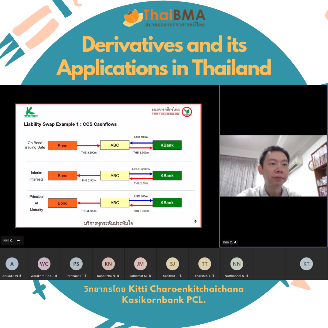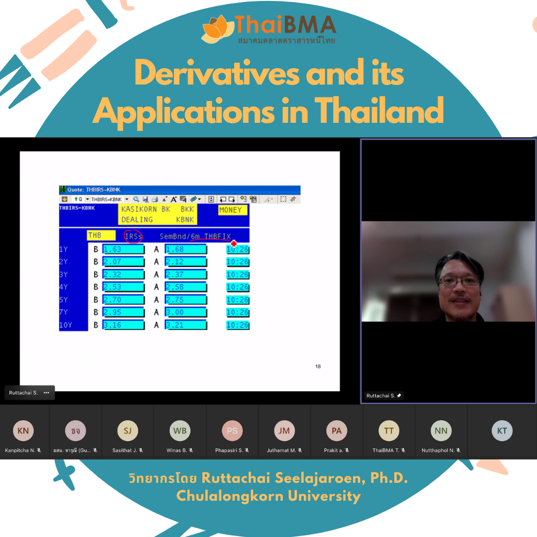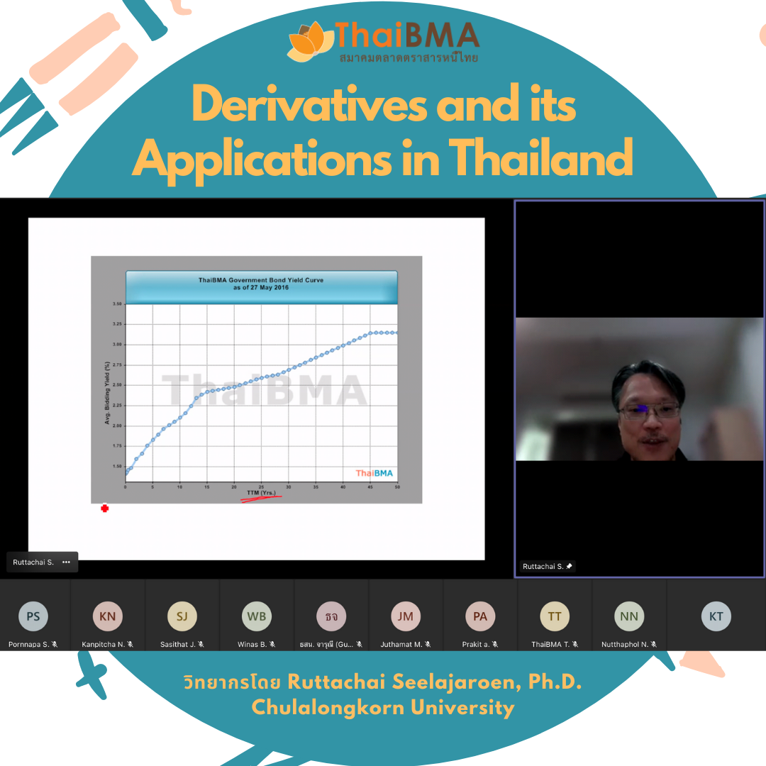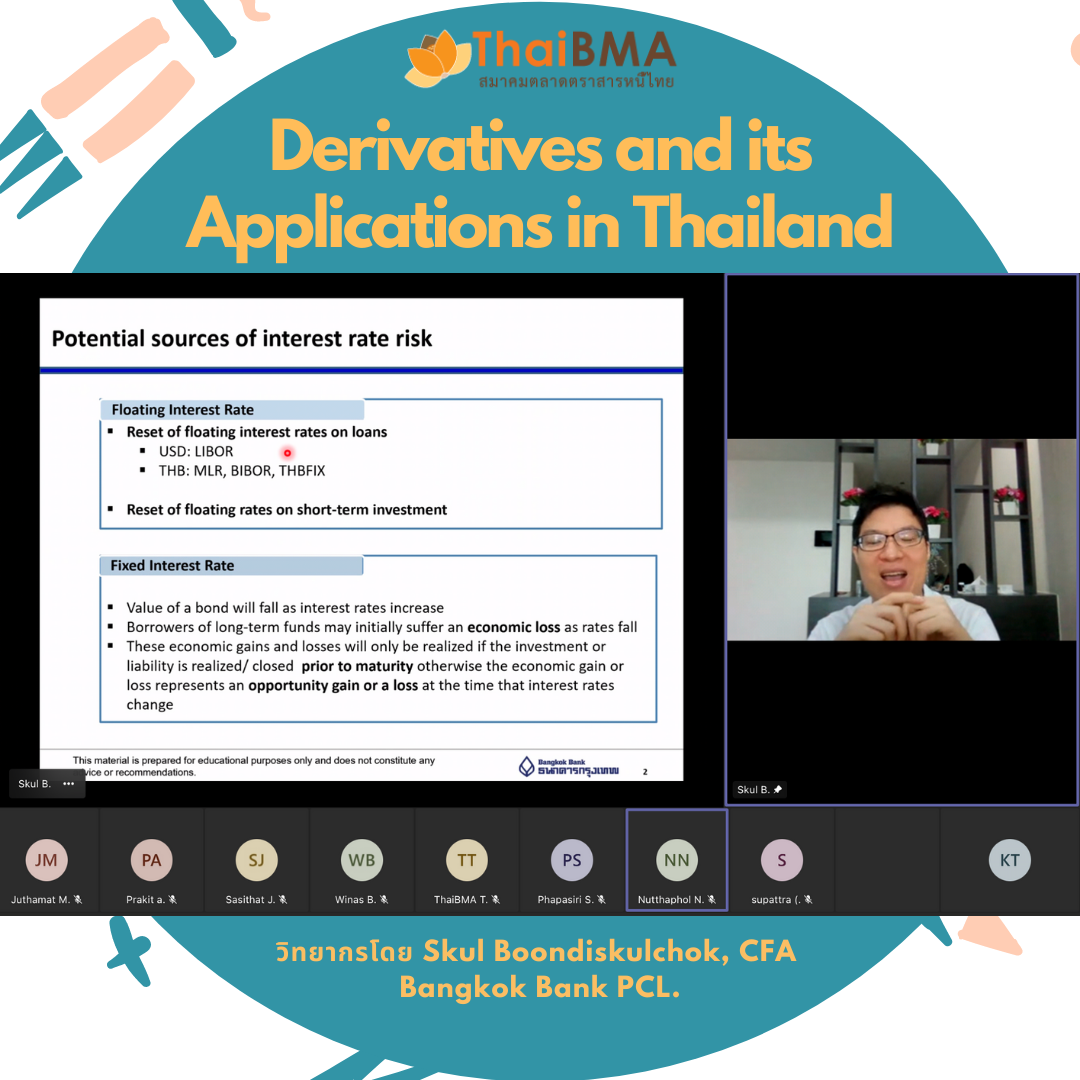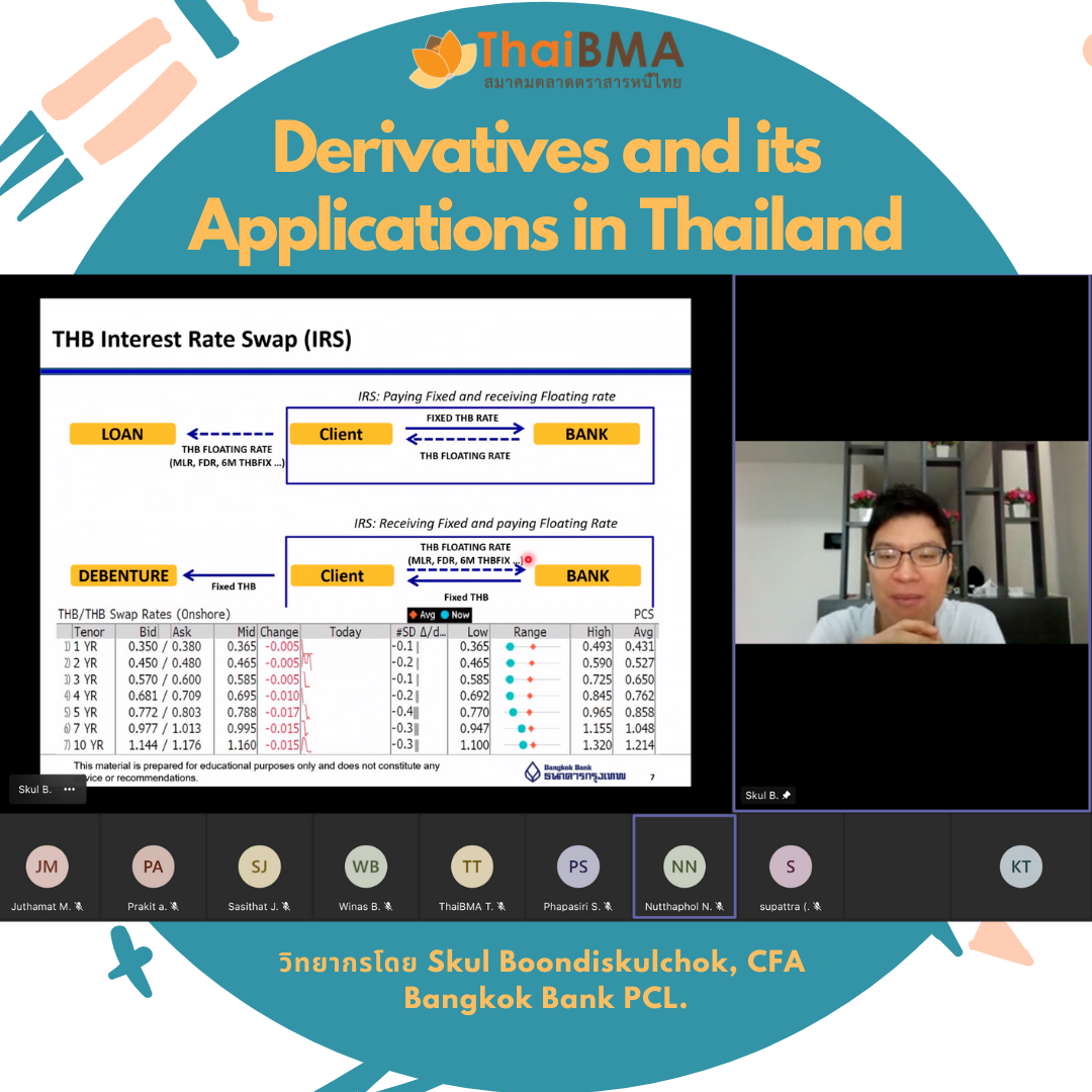 ThaiBMA Gallery ThaiBMA จัดอบรมหลักสูตร Derivatives and its Applications in Thailand 😁สมาคมตลาดตราสารหนี้ไทย (ThaiBMA) จัดอบรมหลักสูตร Derivatives and its Applications in Thailand ในรูปแบบ Remote Classroom (Interactive Online Training) ระหว่างวันที่ 4-5 พฤศจิกายน 2564 ทั้งนี้ สมาคมตลาดตราสารหนี้ไทย (ThaiBMA) ขอขอบคุณวิทยากร และผู้เข้ารับการอบรมทุกท่าน Back to Main Gallery