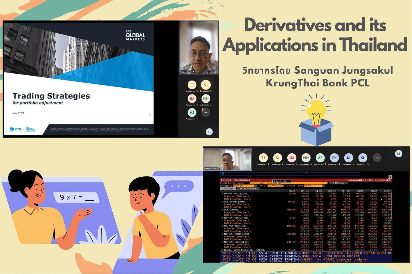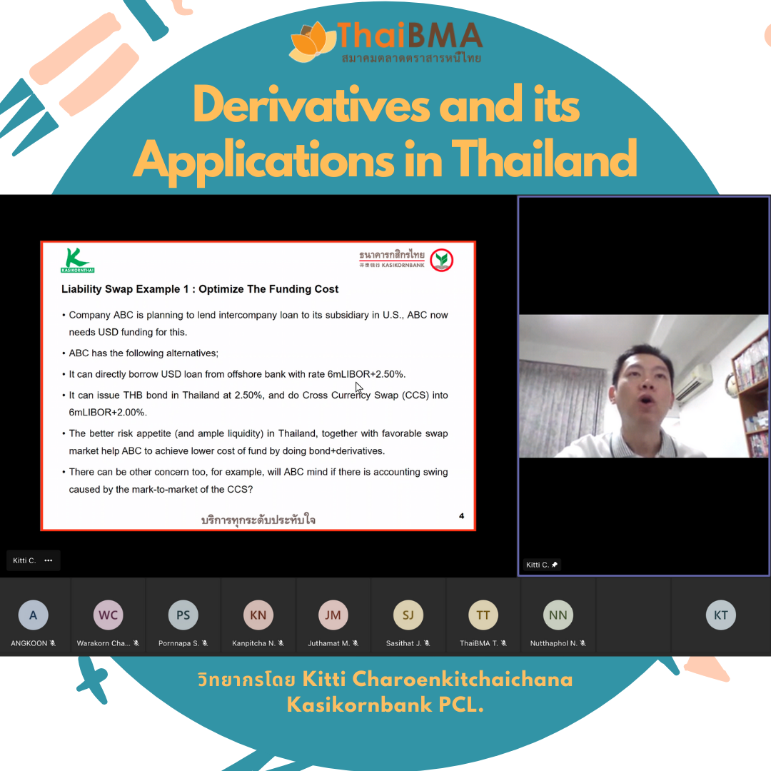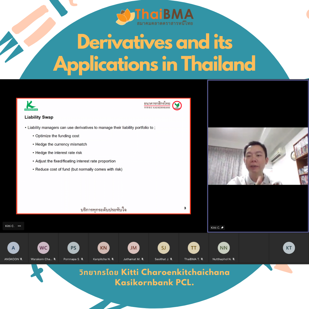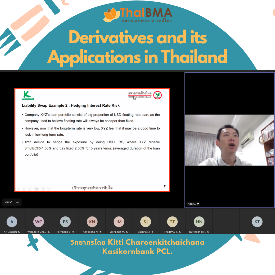 ThaiBMA Gallery ThaiBMA จัดอบรมหลักสูตร Derivatives and its Applications in Thailand 😁สมาคมตลาดตราสารหนี้ไทย (ThaiBMA) จัดอบรมหลักสูตร Derivatives and its Applications in Thailand ในรูปแบบ Remote Classroom (Interactive Online Training) ระหว่างวันที่ 4-5 พฤศจิกายน 2564 ทั้งนี้ สมาคมตลาดตราสารหนี้ไทย (ThaiBMA) ขอขอบคุณวิทยากร และผู้เข้ารับการอบรมทุกท่าน Back to Main Gallery