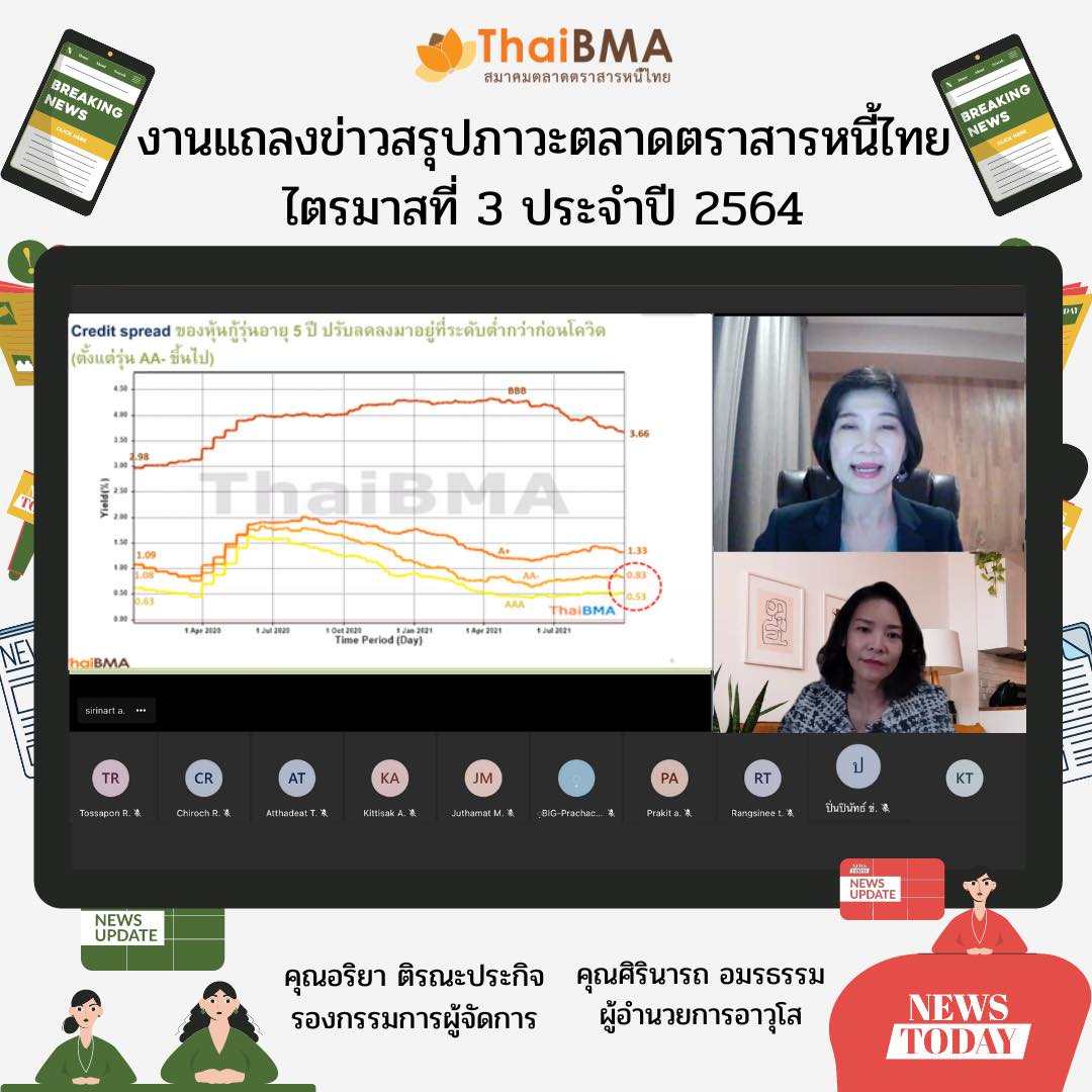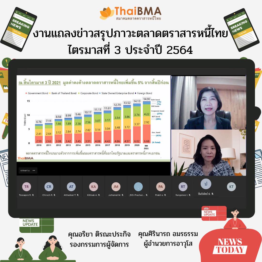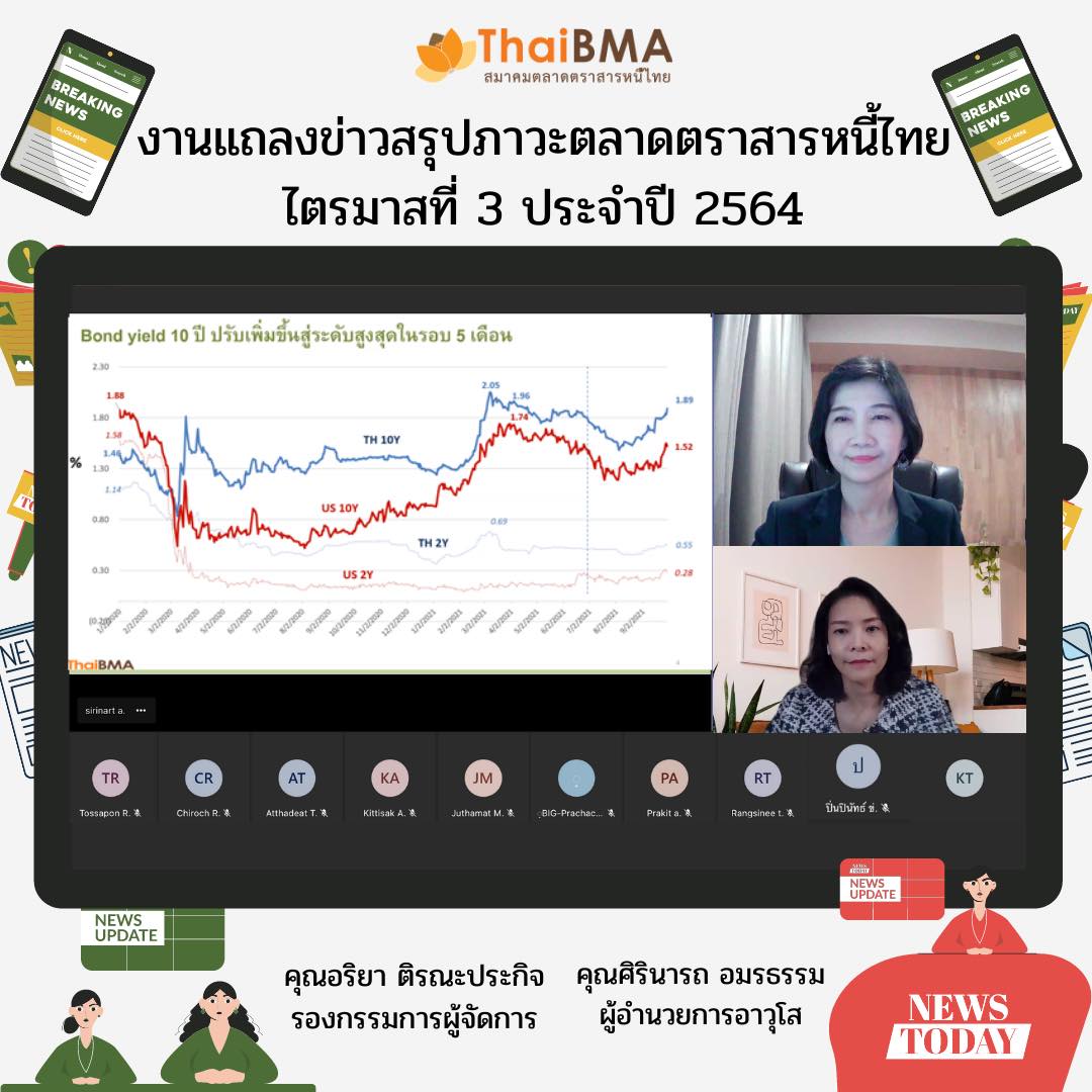 ThaiBMA Gallery ThaiBMA จัดอบรมออนไลน์ Bond Academy Online 2021#Season8 7 ต.ค. 2564 ThaiBMA จัดงานแถลงข่าวสรุปภาวะตลาดตราสารหนี้ไทย ไตรมาสที่ 3 ประจำปี 2564 ท่านสามารถ download เอกสาร Press Release ได้ที่นี่ 👇👇👇 สรุปภาวะตลาดตราสารหนี้ไทยประจำไตรมาสที่ 3 (Press Release) 🌎http://www.thaibma.or.th/.../y2021/PressRelease_Q3-2021.pdf เอกสารประกอบงานแถลงข่าว (Presentation) 🌎http://www.thaibma.or.th/doc/press/y2021/Press_Q3-2021.pdf Back to Main Gallery