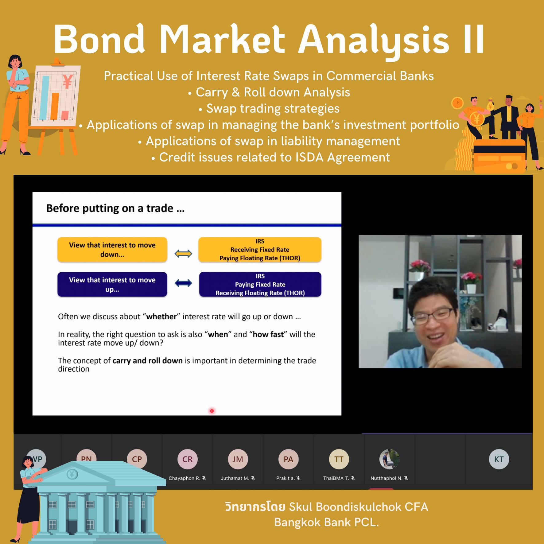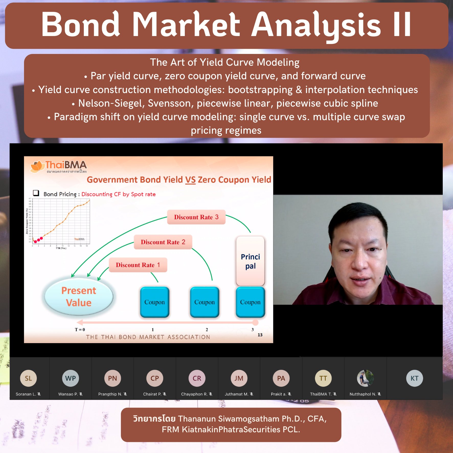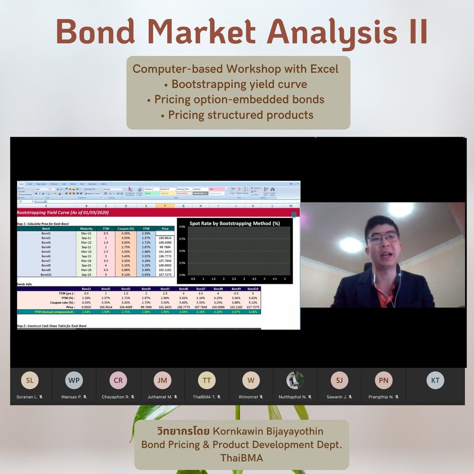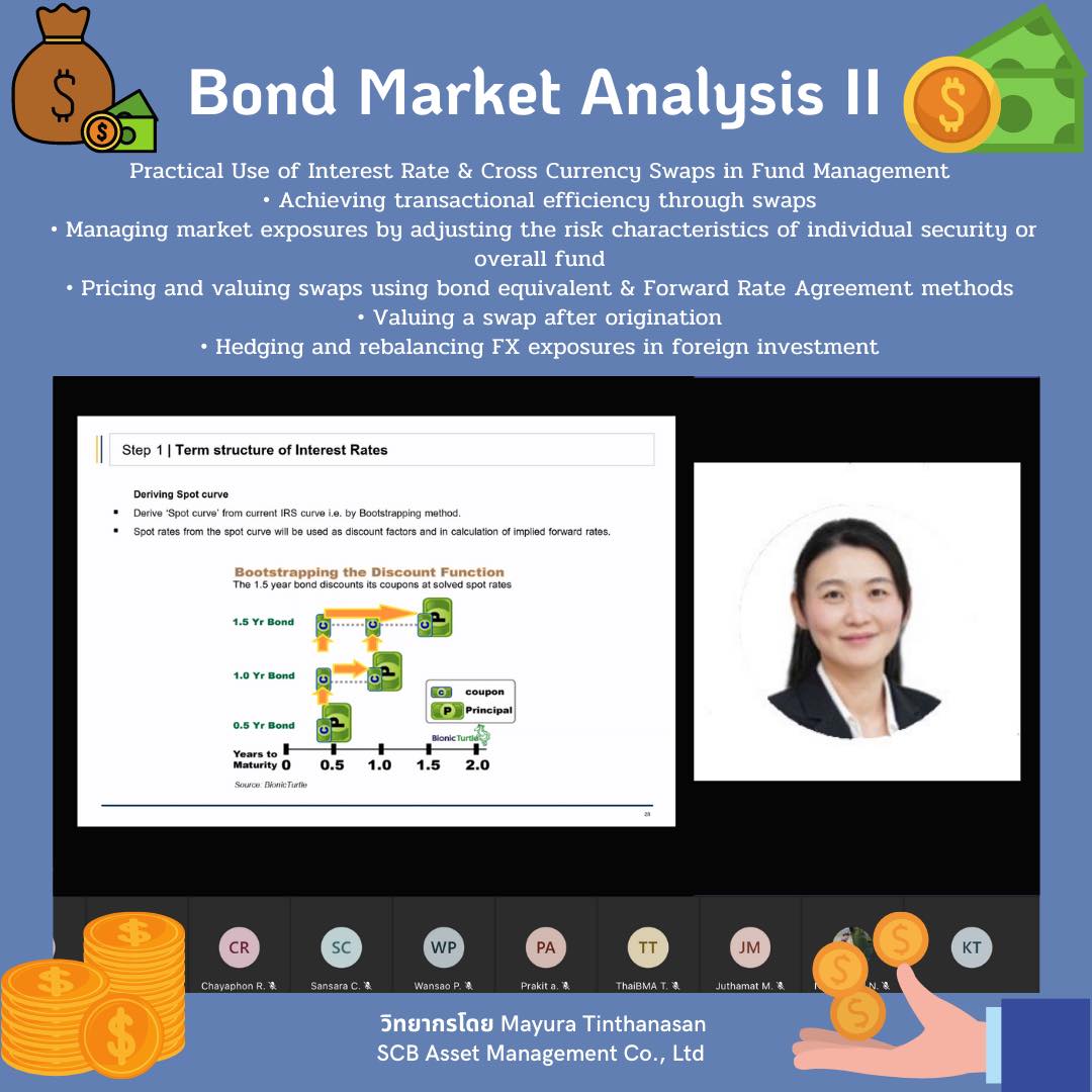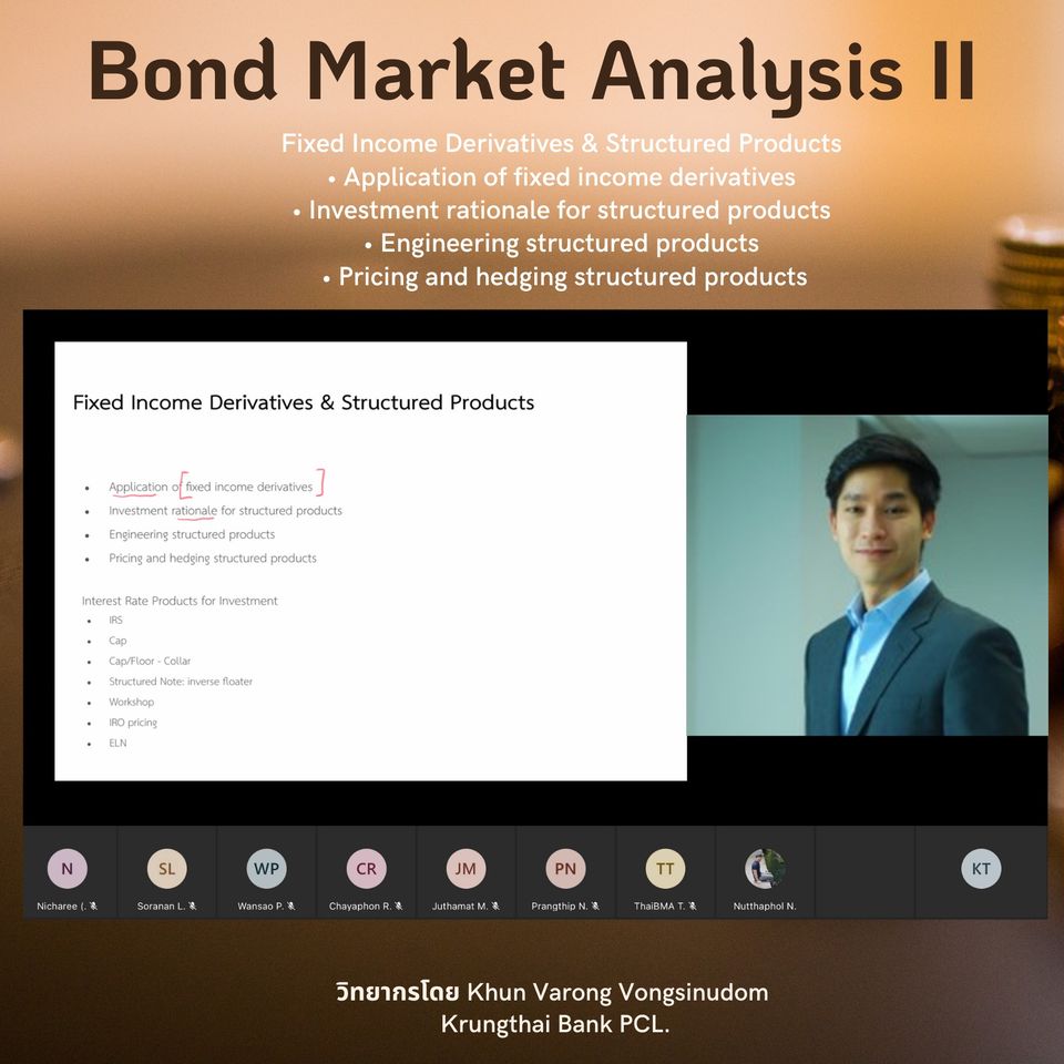 ThaiBMA Gallery ThaiBMA จัดอบรมหลักสูตร Bond Market Analysis II 😁สมาคมตลาดตราสารหนี้ไทย (ThaiBMA) จัดอบรมหลักสูตร Bond Market Analysis II ในรูปแบบ Remote Classroom (Interactive Online Training) ระหว่างวันที่ 13-14 ธันวาคม 2564 ======================================== 🙏ทั้งนี้ สมาคมตลาดตราสารหนี้ไทย ขอขอบคุณท่านวิทยกรทุกท่านและท่านผู้เข้าเรียนทุกท่านค่ะ Back to Main Gallery