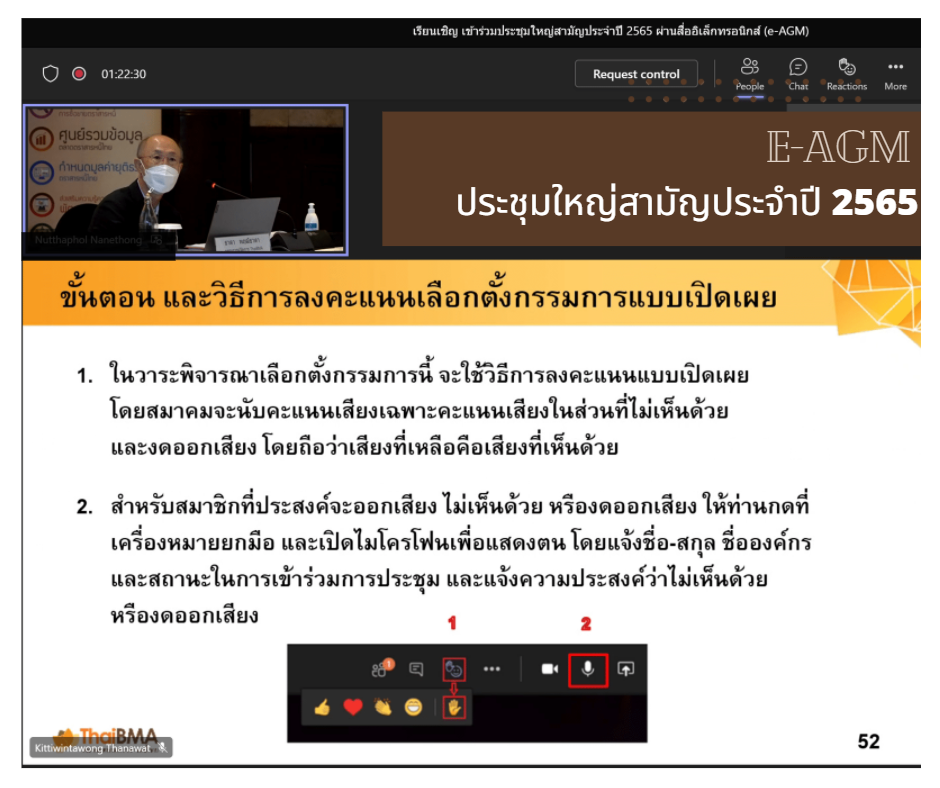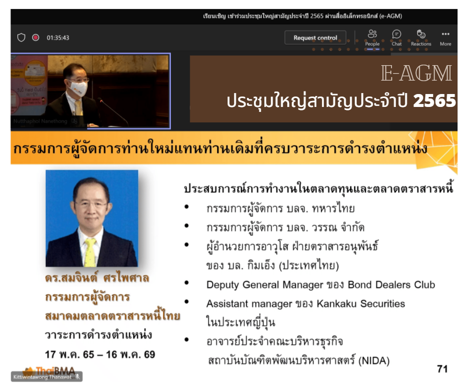 ThaiBMA Gallery ThaiBMA จัดประชุมใหญ่สามัญประจำปี 2565 สมาคมตลาดตราสารหนี้ไทย (ThaiBMA)จัดประชุมใหญ่สามัญประจำปี 2565 ✨ ซึ่งเป็นการประชุมผ่านสื่ออิเล็กทรอนิกส์ (E-AGM) 💻🌐 ในวันพฤหัสบดีที่ 7 เมษายน 2565 เวลา 11.00-12.00 น. โดยมีคุณสมหมาย ภาษี ประธานกรรมการสมาคม เป็นประธานในที่ประชุม Back to Main Gallery