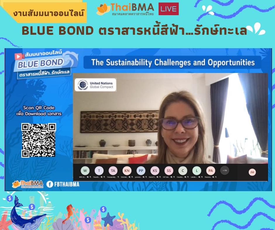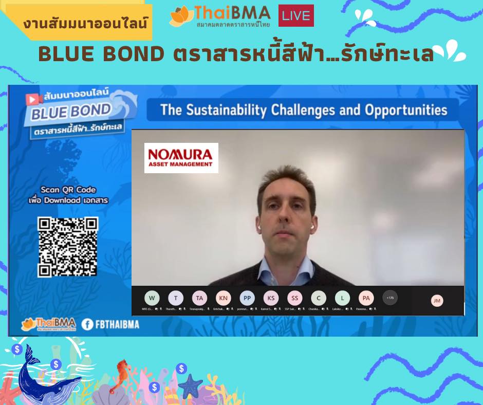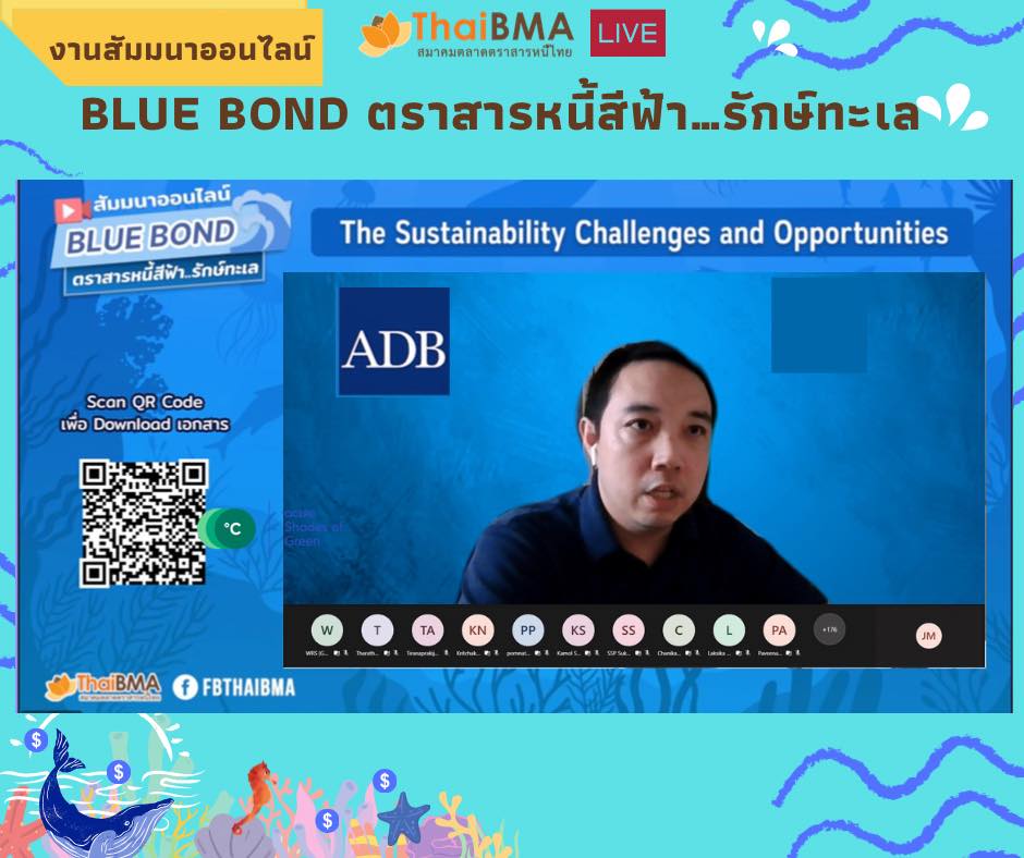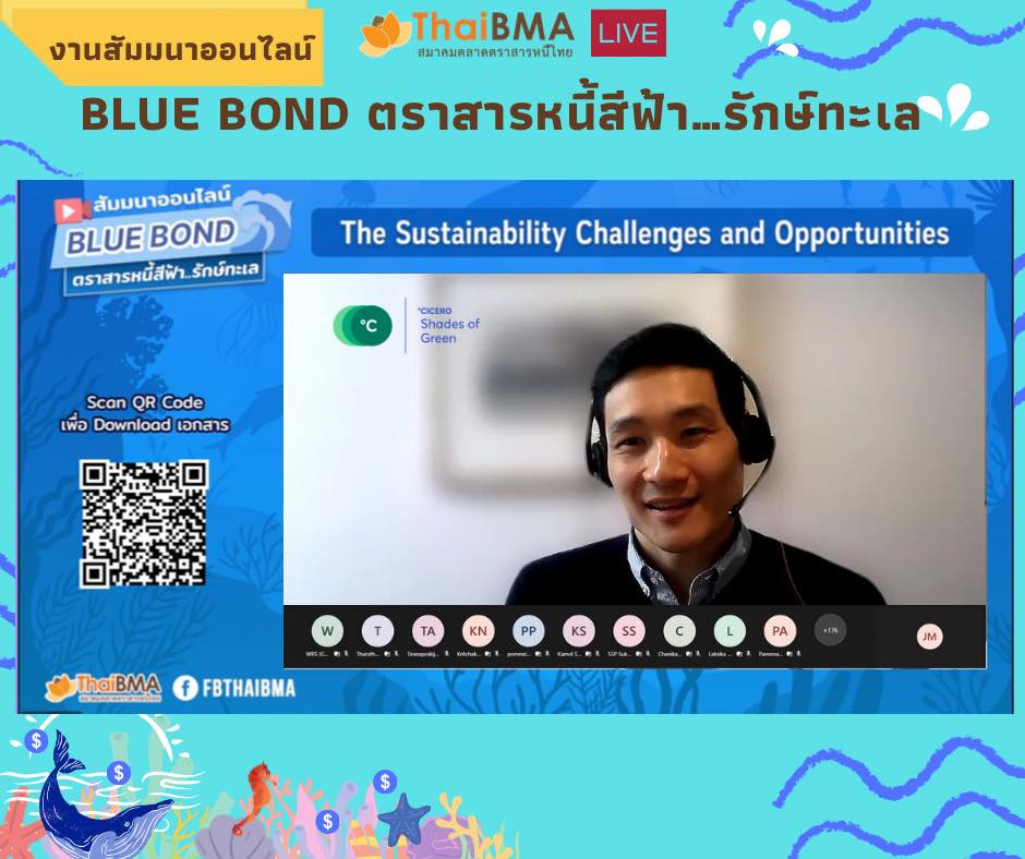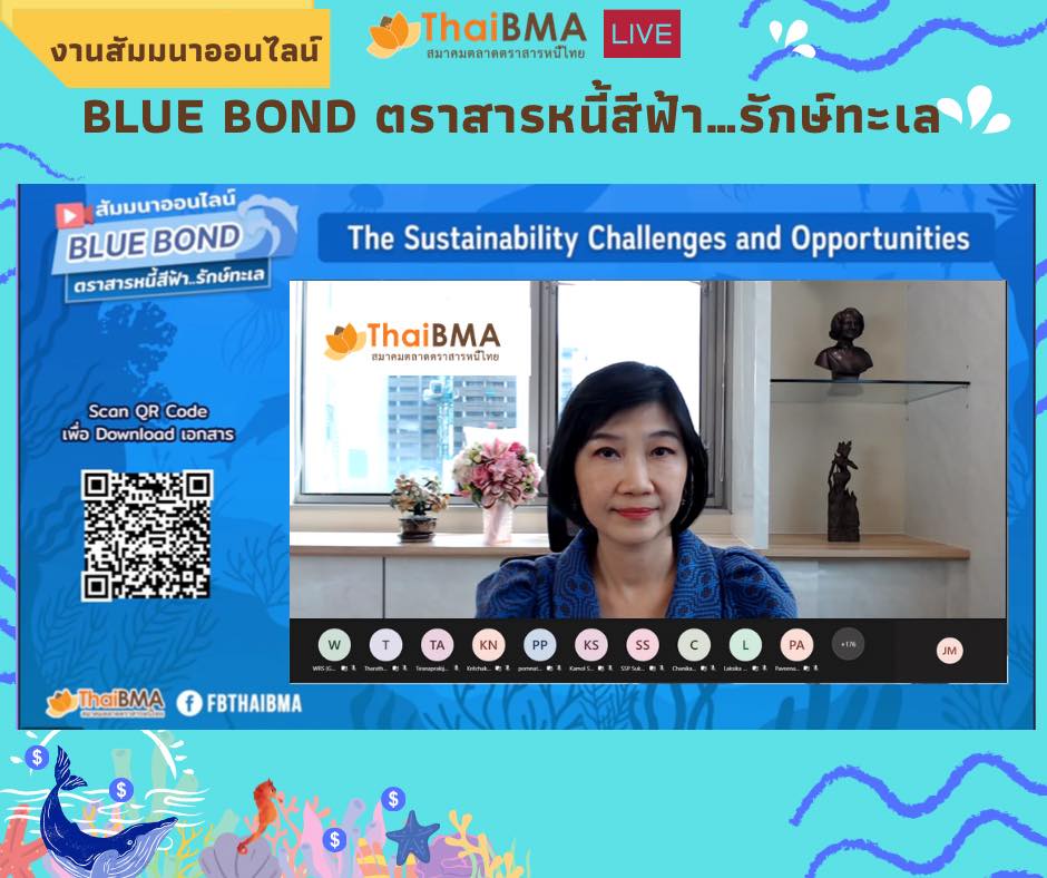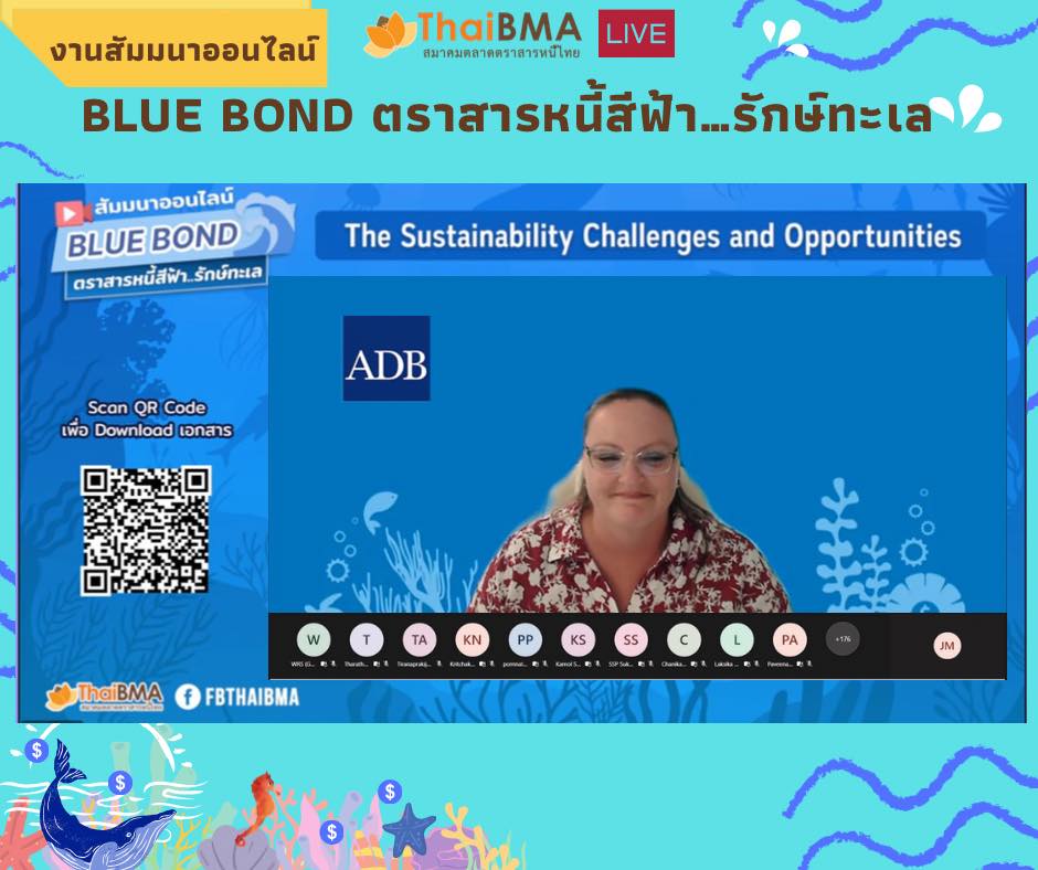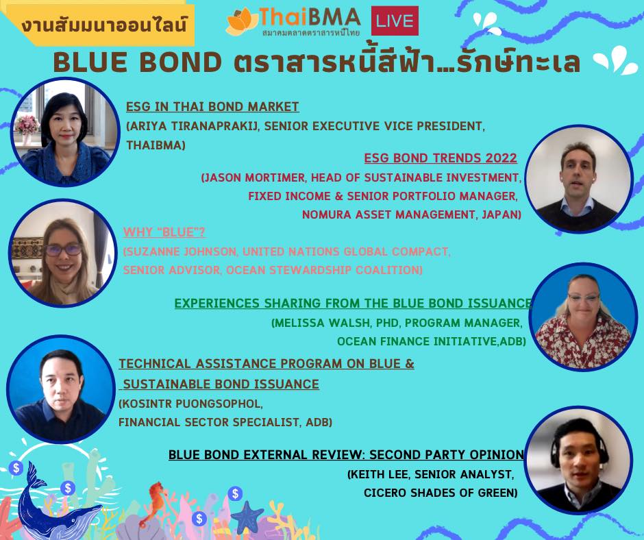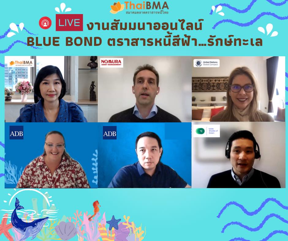 ThaiBMA Gallery ThaiBMA จัดงานสัมมนาออนไลน์ Blue bond ตราสารหนี้สีฟ้า…รักษ์ทะเล วันที่ 8 มีนาคม 2565 สมาคมตลาดตราสารหนี้ไทยได้จัดงานสัมมนาออนไลน์ Blue bond ตราสารหนี้สีฟ้า…รักษ์ทะเล 🐚🐋🐬 🙏🏻โดยได้รับเกียรติจาก Ms. Suzanne Johnson จาก United Nations Global Compact, Dr. Melissa Walsh จาก Asian Development Bank (ADB), Mr. Jason Mortimer จาก Nomura Asset Management, Japan, Dr. Keith Lee จาก CICERO Shades of Green และ คุณโกสินทร์ พึงโสภณ จาก ADB. สำหรับการให้ความรู้ในส่วนของทิศทางตลาดตราสารหนี้ ESG ของไทย มุมมองของนักลงทุนที่มีต่อตราสารหนี้ ESG รวมถึงโอกาสและความท้าทายของตราสารหนี้สีฟ้า "Blue Bond" ที่จะช่วยอนุรักษ์และรักษาสภาพแวดล้อมทางทะเลอย่างยั่งยืน อีกทั้งทราบขั้นตอนและแนวทางในการประเมินการนำเงินไปใช้ในโครงการสีฟ้า และการรับการสนับสนุน/ช่วยเหลือในการออกตราสารหนี้เพื่อความยั่งยืน ท่านสามารถชมเทปบันทึกภาพย้อนหลังได้ที่ FB : ThaiBMA Back to Main Gallery