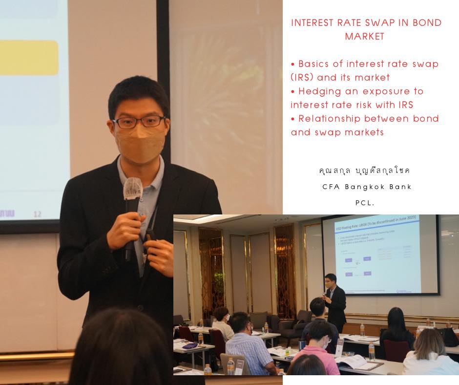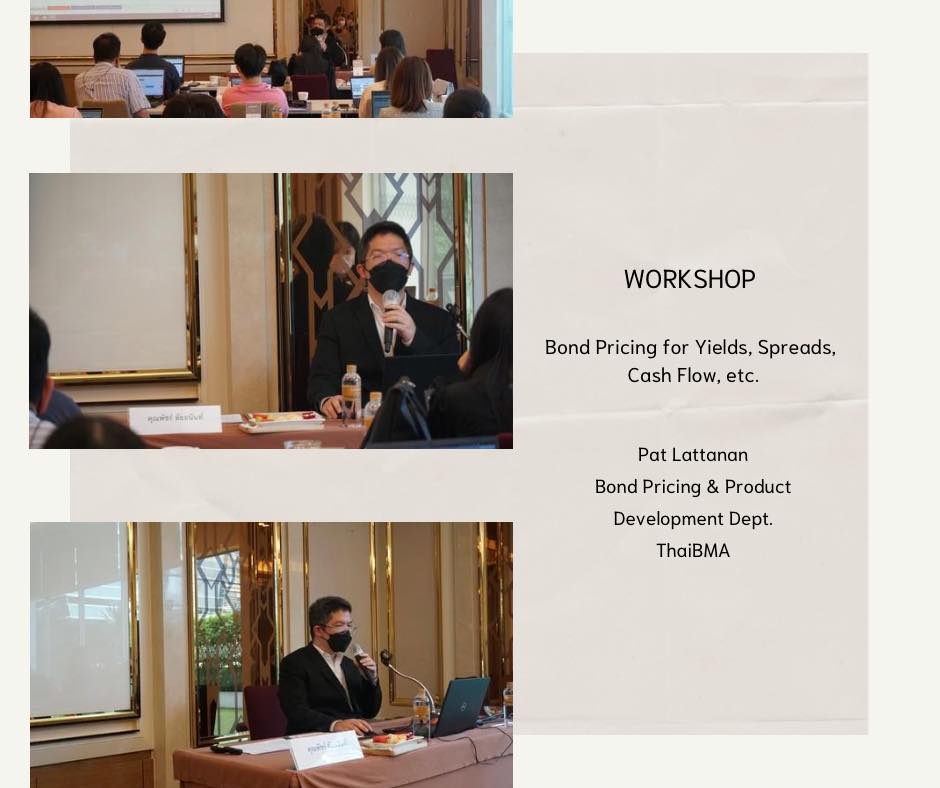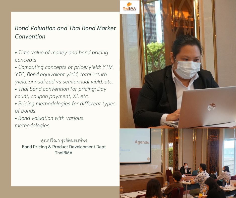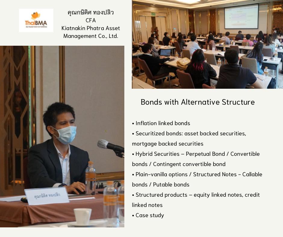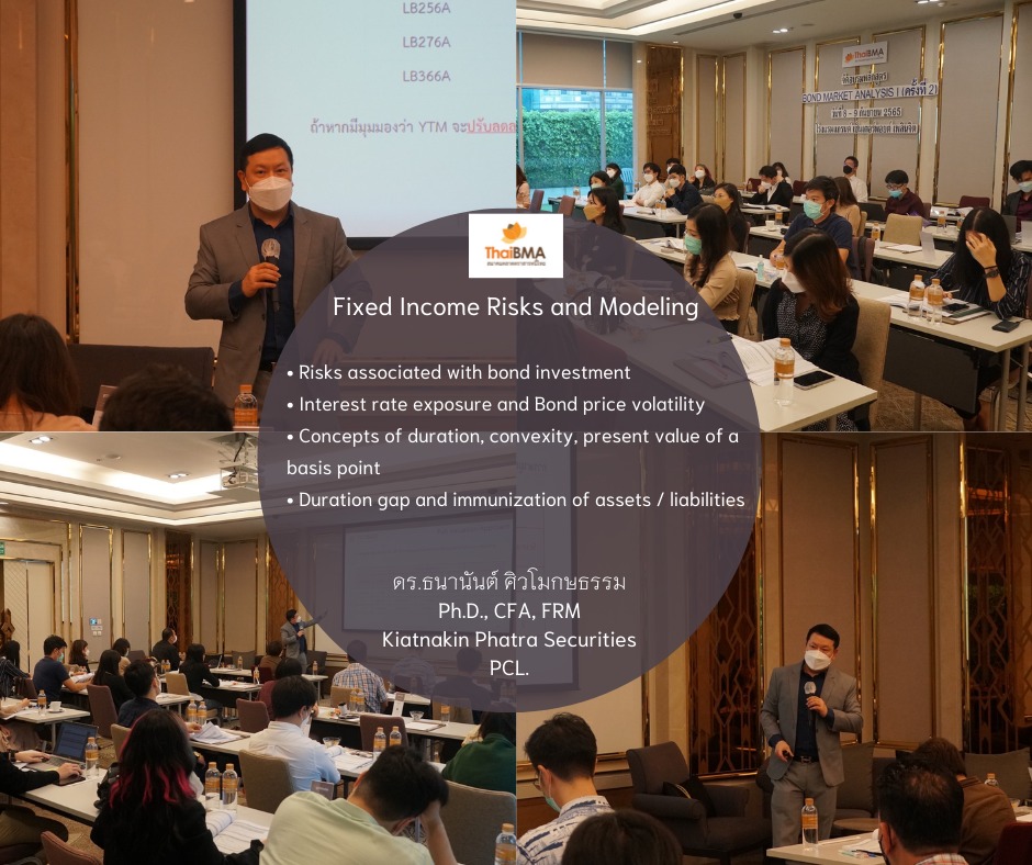 ThaiBMA Gallery ThaiBMA จัดอบรมหลักสูตร Bond Market Analysis l ครั้งที่ 2 ภาพบรรยากาศการเรียน หลักสูตร Bond Market Analysis l ครั้งที่ 2 จัดขึ้นในวันที่ 8-9 กันยายน 2565 เวลา 09.00 – 17.00 น. ณ Grande Centre Point Ploenchit ทั้งนี้การเข้าเรียนในรูปแบบ Classroom ได้ดำเนินการจัดที่นั่งเว้นระยะห่างตามมาตราการ และท่านวิทยากร/ผู้เรียนได้รับตรวจหาเชื้อ Covid-19 ผ่าน ATK เรียบร้อยค่ะ ======================================== 🔎ท่านสามารถติดตามตารางอบรม และรายละเอียดหลักสูตรอื่นๆของ ThaiBMA เพิ่มเติมได้ที่ http://www.thaibma.or.th/EN/Training/SeminarCourse.aspx Back to Main Gallery