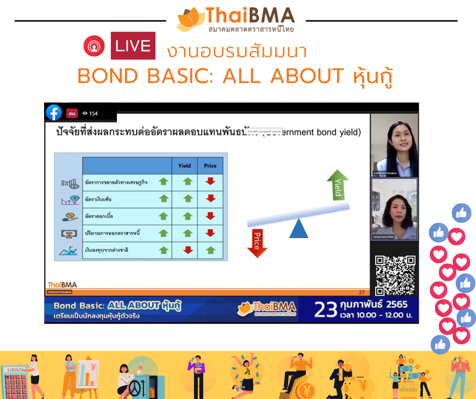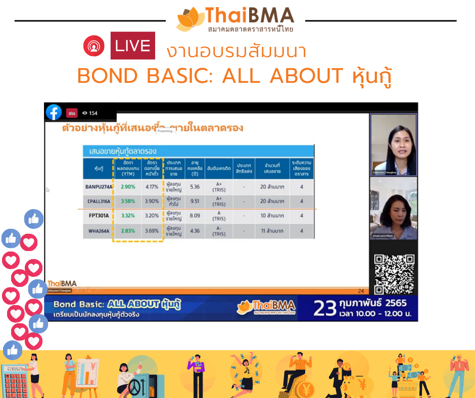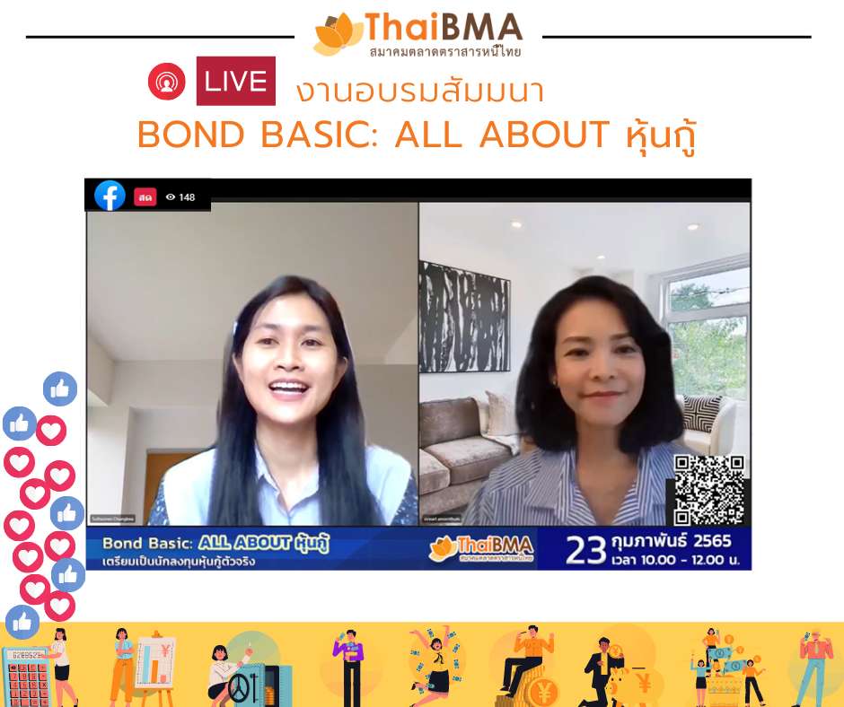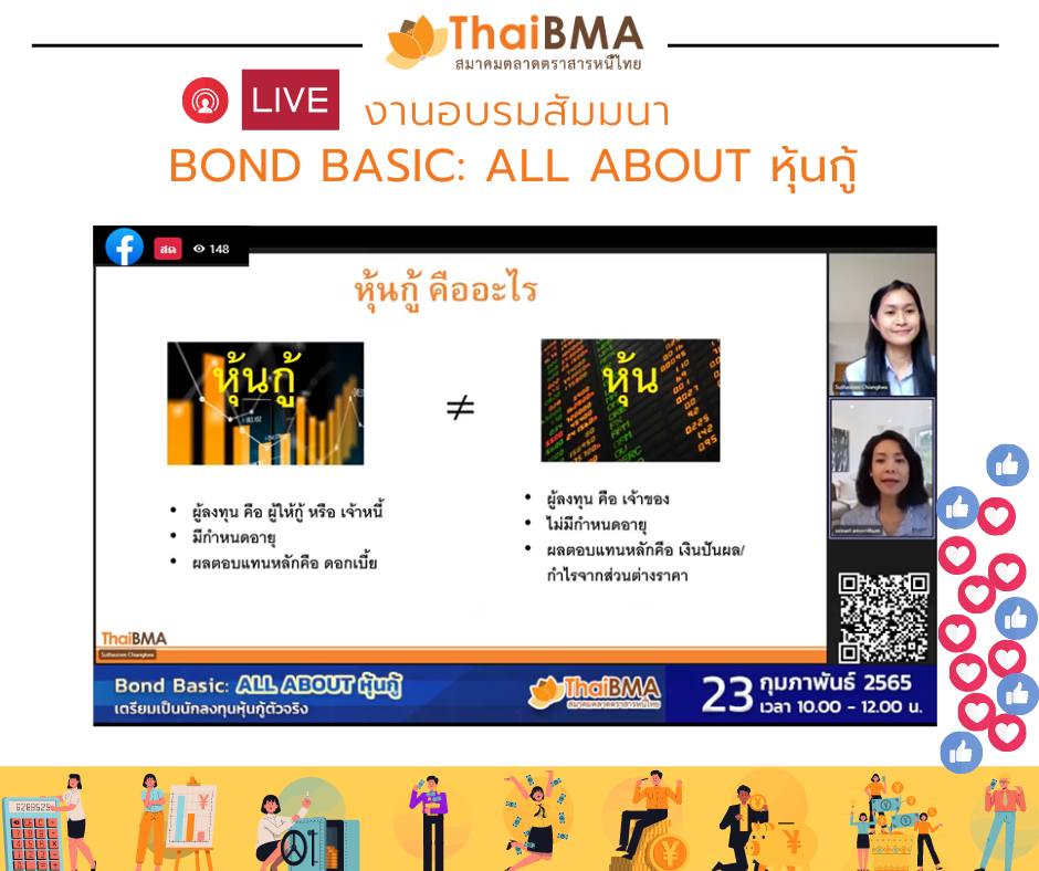 ThaiBMA Gallery ThaiBMA จัดอบรม “Bond Basic: All about หุ้นกู้” 🎥😍ภาพบรรยากาศงาน “Bond Basic: All about หุ้นกู้” ในรูปแบบ Online ผ่าน FB Live ThaiBMA วันพุธที่ 23 กุมภาพันธ์ พ.ศ. 2565 📊📜📉การอบรมดีๆ เพื่อเรียนรู้เกี่ยวกับตลาดตราสารหนี้ไทย และเพื่อเตรียมพร้อมสู่การเป็นนักลงทุนตราสารหนี้ตัวจริง หวังว่าทุกท่านจะได้ความรู้ในการนำไปใช้ก่อนการลงทุนตราสารหนี้และทำให้ลงทุนอย่างมั่นใจนะคะ 😀ท่านสามารถชมย้อนหลังได้ที่ Facebook live ThaiBMA ค่ะ Back to Main Gallery