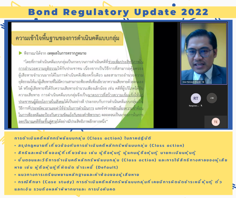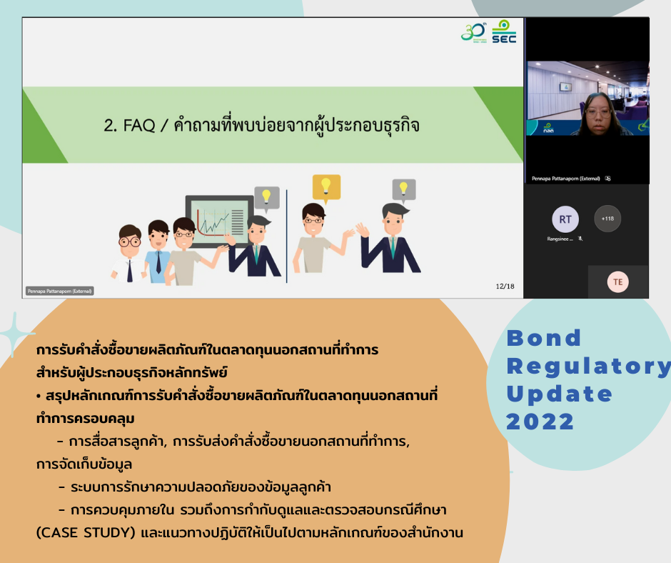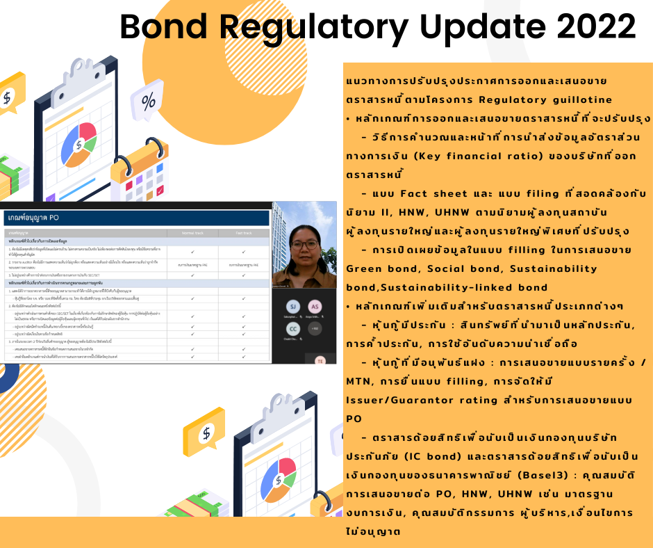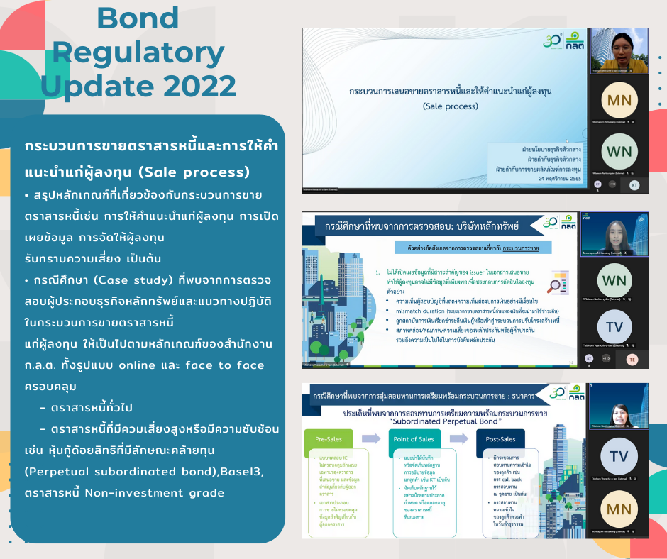 ThaiBMA Gallery ThaiBMA จัดอบรมหลักสูตรความรู้ด้านกฎระเบียบในตลาดตราสารหนี้ (Bond Regulatory Update 2022) 😀สมาคมตลาดตราสารหนี้ไทย (ThaiBMA) จัดอบรมหลักสูตรความรู้ด้านกฎระเบียบในตลาดตราสารหนี้ (Bond Regulatory Update 2022) ในรูปแบบ Remote Classroom (Interactive Online Training) วันที่ 24-25 พฤศจิกายน 2565 Back to Main Gallery