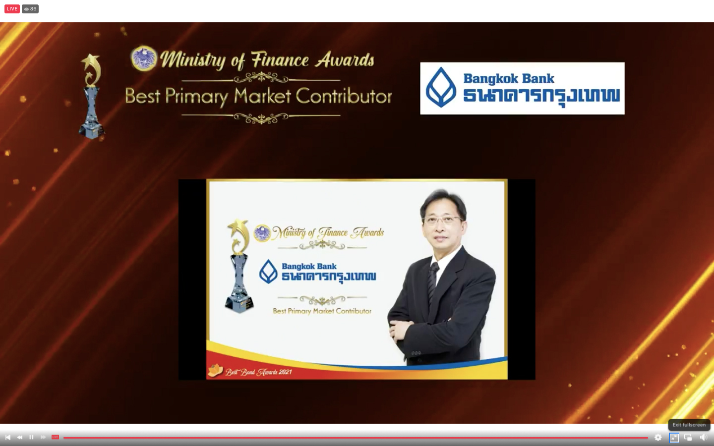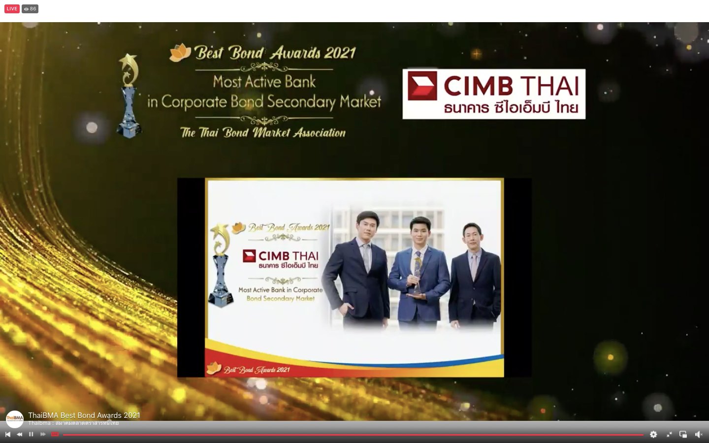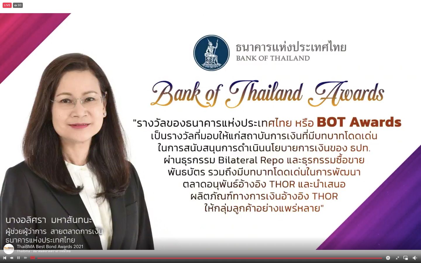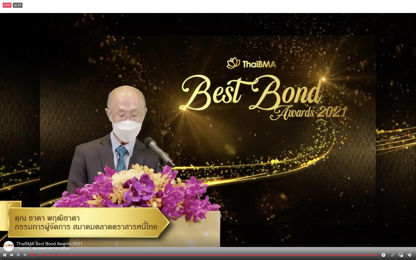 ThaiBMA Gallery ThaiBMA จัดงานมอบรางวัลตราสารหนี้ยอดเยี่ยมแห่งปี 2564 (ThaiBMA Best Bond Awards 2021) ภาพบรรยากาศงานมอบรางวัลตราสารหนี้ยอดเยี่ยมแห่งปี 2564 (ThaiBMA Best Bond Awards 2021) เพื่อยกย่ององค์กรและบุคลากรที่มีความโดดเด่นในธุรกรรมตราสารหนี้ ในวันพุธที่ 30 มีนาคม 2565 เวลา 14:00 น. – 15:30 น. ผ่าน Facebook ThaiBMA >>> ท่านสามารถชมภาพบรรยากาศเพิ่มเติมได้ที่นี่ <<< Back to Main Gallery