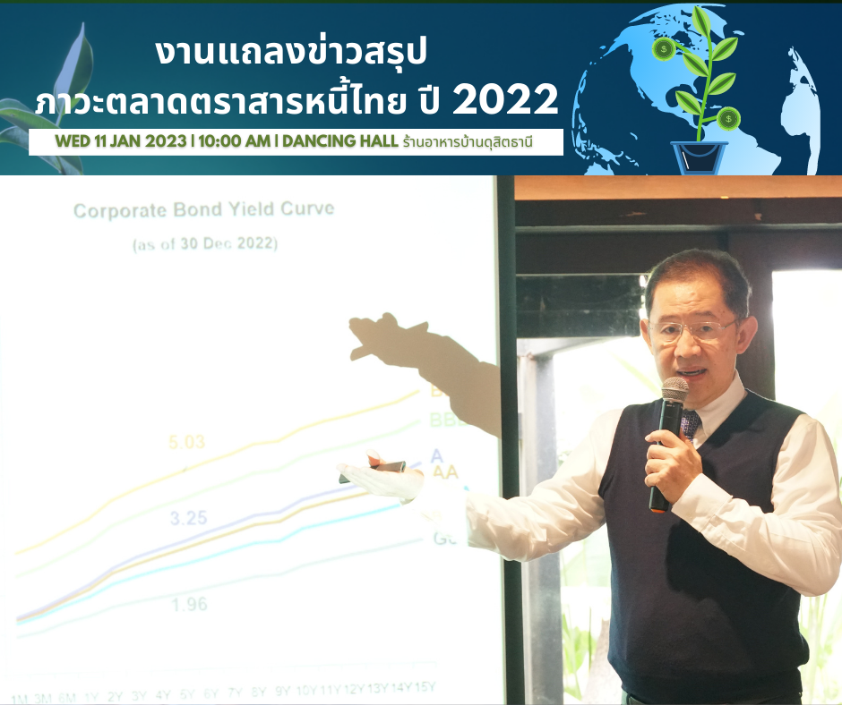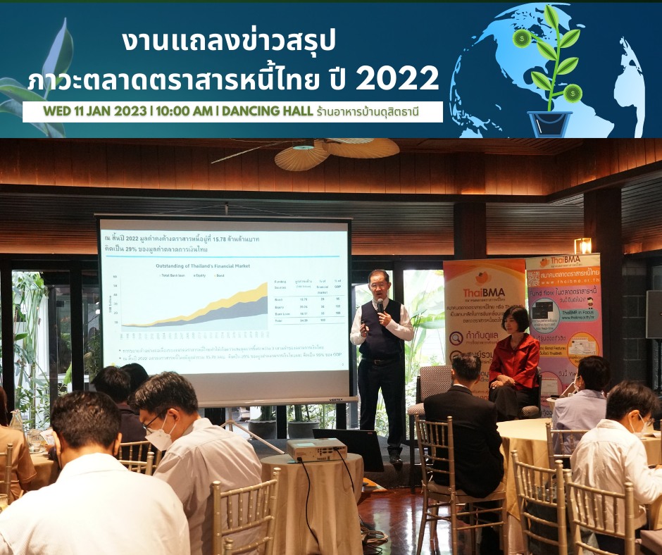 ThaiBMA Gallery ThaiBMA จัดแถลงข่าวออนไลน์ สรุปภาวะตลาดตราสารหนี้ไทยปี 2563 และแนวโน้มปี 2564 11 มกราคม 2566 ThaiBMA จัดงานแถลงข่าวสรุปภาวะตลาดตราสารหนี้ไทย ปี 2565 ณ ห้อง Dancing Hall ร้านอาหารบ้านดุสิตธานี ท่านสามารถ download เอกสาร Press Release ได้ที่นี่ 👉🏻ThaiBMA สรุปภาวะตลาดตราสารหนี้ไทยปี 2565 🌐https://www.thaibma.or.th/doc/press/y2023/Press012023.pdf 👉🏻เอกสารประกอบงานแถลงข่าว ThaiBMA สรุปภาวะตลาดตราสารหนี้ไทยปี 2565 🌐https://www.thaibma.or.th/doc/press/y2023/con012023.pdf Back to Main Gallery