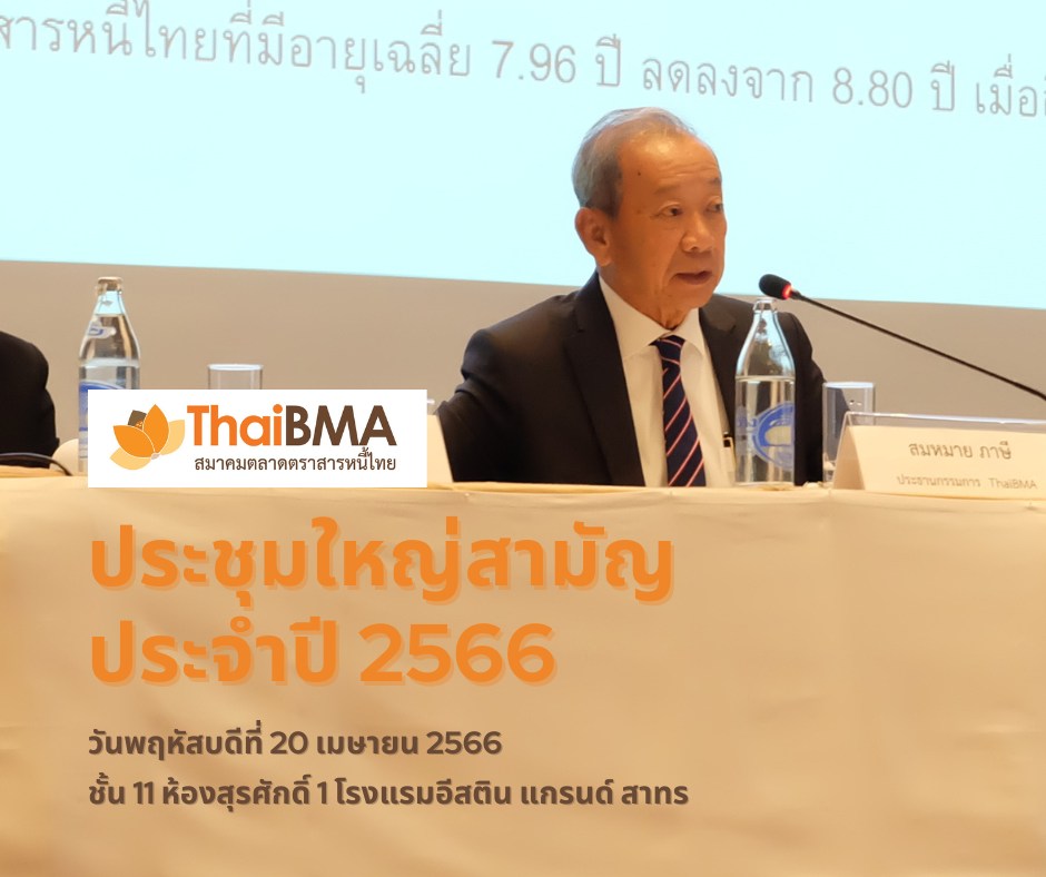 ThaiBMA Gallery ThaiBMA จัดประชุมใหญ่สามัญประจำปี 2566 20 เมษายน 2566 สมาคมตลาดตราสารหนี้ไทย (ThaiBMA) จัดประชุมใหญ่สามัญประจำปี 2566 ณ ชั้น 11 ห้องสุรศักดิ์ 1 โรงแรมอีสติน แกรนด์ สาทร 😀โดยมีคุณสมหมาย ภาษี ประธานกรรมการสมาคม เป็นประธานในที่ประชุม 🙏 Back to Main Gallery