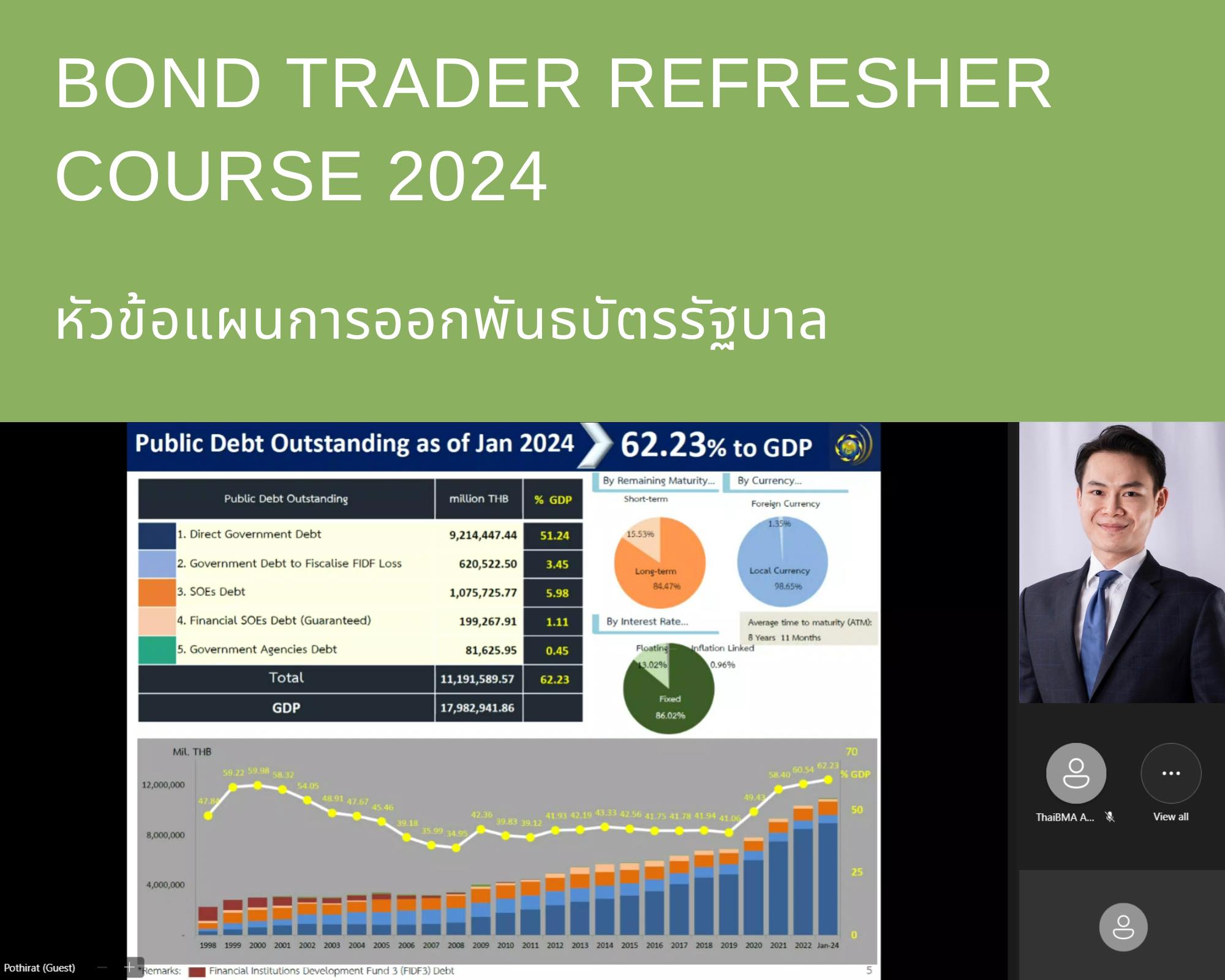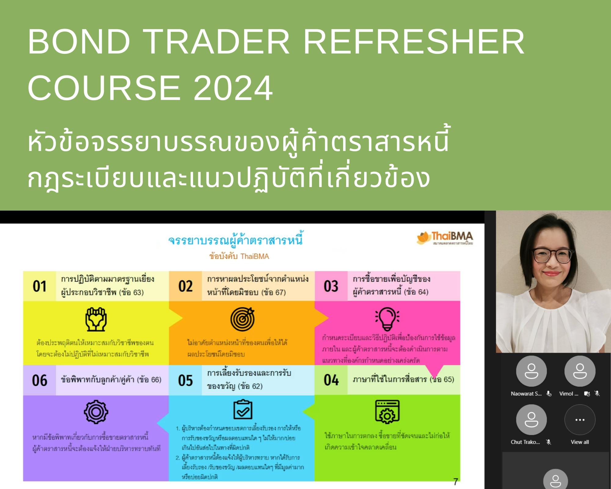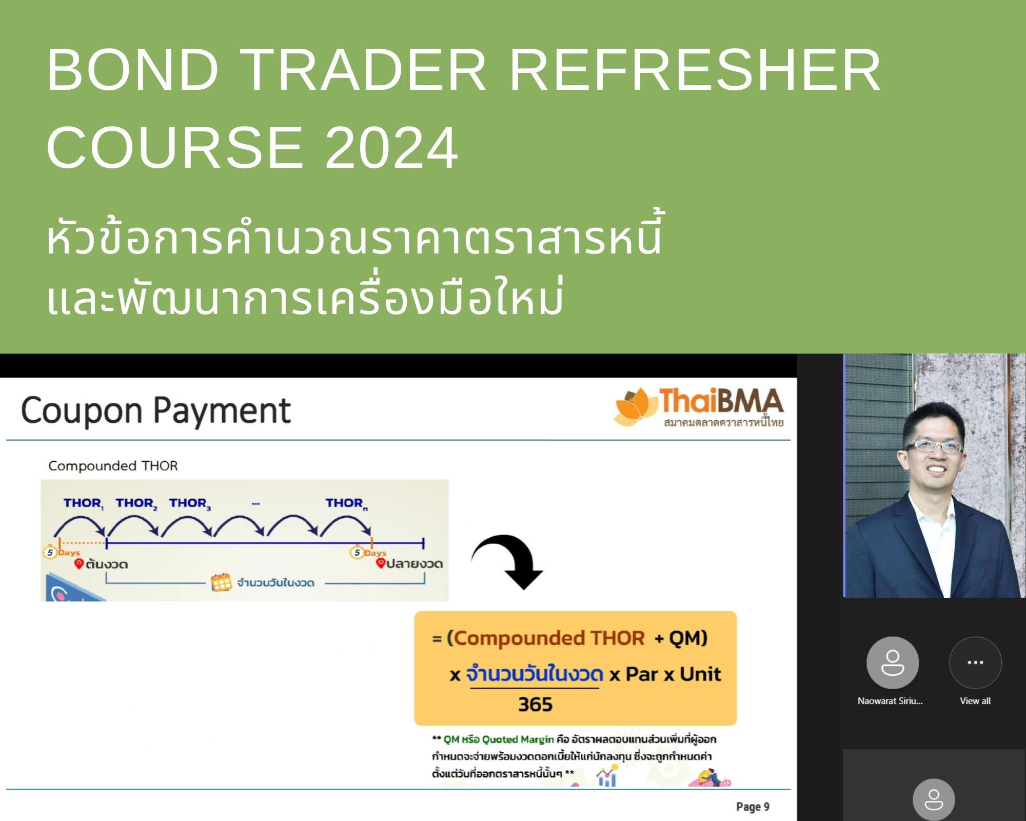 ThaiBMA Gallery ThaiBMA จัดอบรมหลักสูตร Bond Trader Refresher Course 2024 สมาคมตลาดตราสารหนี้ไทย (ThaiBMA) จัดอบรมหลักสูตร Bond Trader Refresher Course 2024ในรูปแบบ Online Training ผ่านระบบ MS Teams ครั้งที่ 1 วันเสาร์ที่ 23 มีนาคม 2567 😊สมาคมตลาดตราสารหนี้ไทย (ThaiBMA) ขอขอบคุณวิทยากร และผู้เข้ารับการอบรมทุกท่าน โดยท่านสามารถติดตามหลักสูตรอื่นๆ ของ ThaiBMA เพิ่มเติมได้ที่ http://www.thaibma.or.th/EN/Training/SeminarCourse.aspx Back to Main Gallery