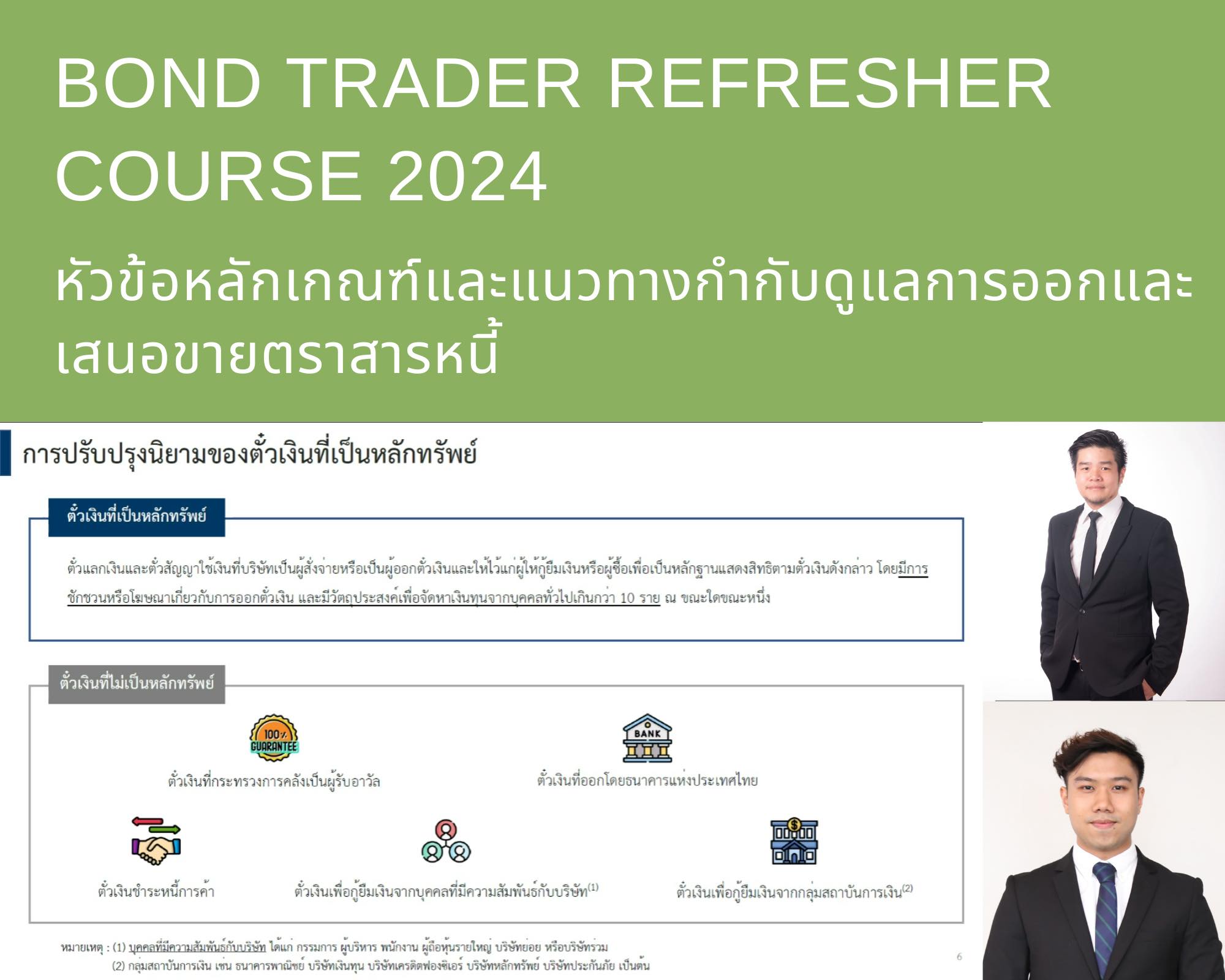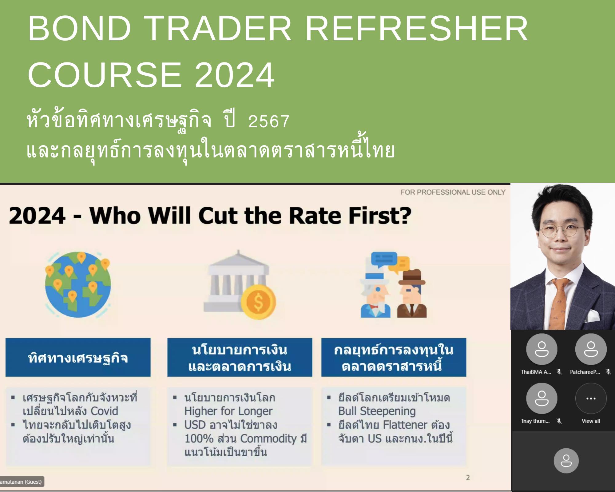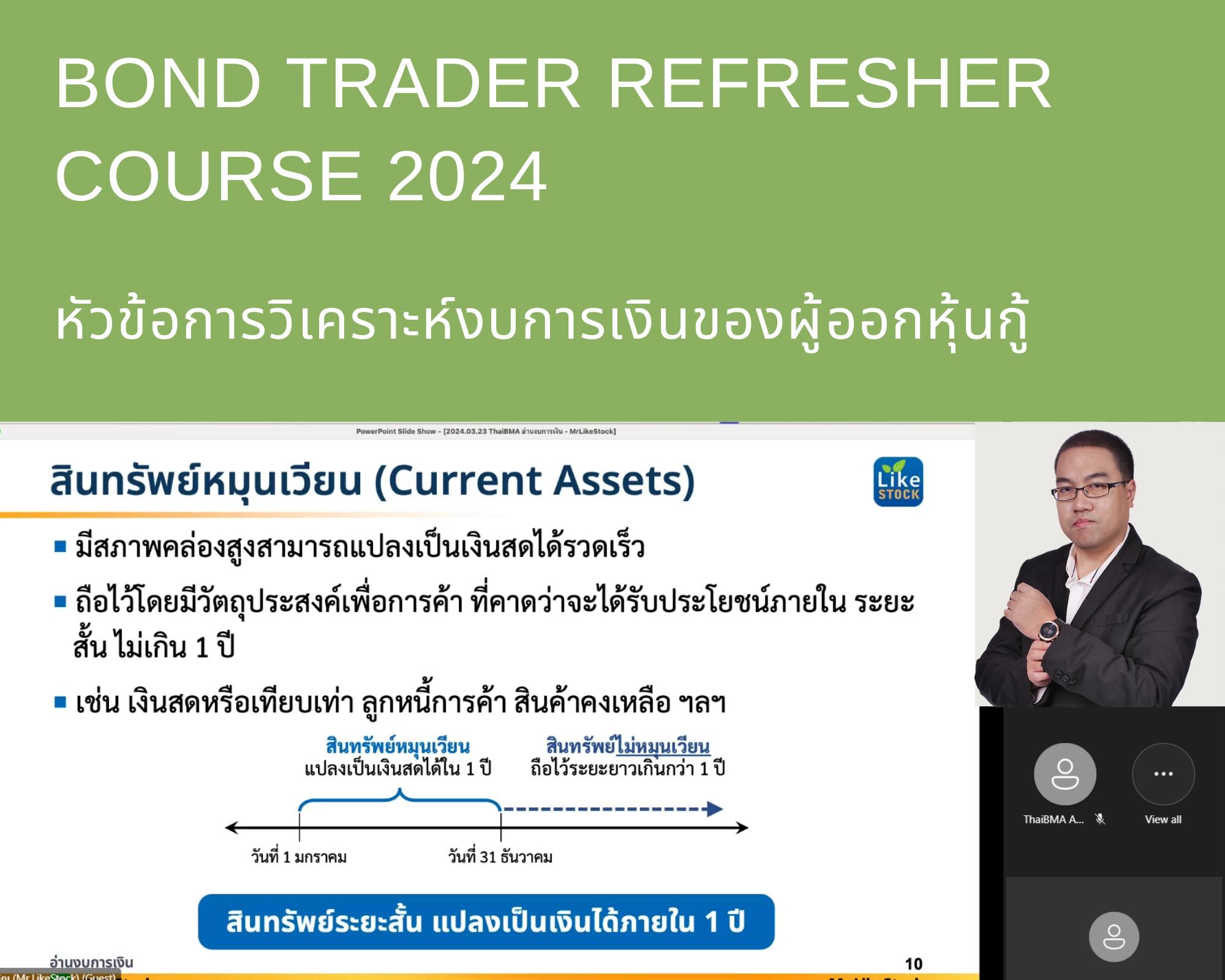 ThaiBMA Gallery ThaiBMA จัดอบรมหลักสูตร Bond Trader Refresher Course 2024 สมาคมตลาดตราสารหนี้ไทย (ThaiBMA) จัดอบรมหลักสูตร Bond Trader Refresher Course 2024ในรูปแบบ Online Training ผ่านระบบ MS Teams ครั้งที่ 1 วันเสาร์ที่ 23 มีนาคม 2567 😊สมาคมตลาดตราสารหนี้ไทย (ThaiBMA) ขอขอบคุณวิทยากร และผู้เข้ารับการอบรมทุกท่าน โดยท่านสามารถติดตามหลักสูตรอื่นๆ ของ ThaiBMA เพิ่มเติมได้ที่ http://www.thaibma.or.th/EN/Training/SeminarCourse.aspx Back to Main Gallery