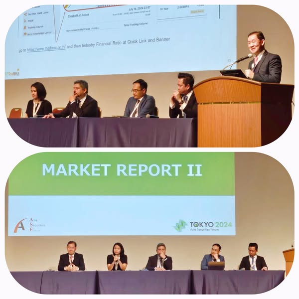 ThaiBMA Gallery ThaiBMA เข้าร่วมการประชุมสามัญประจำปีครั้งที่ 29 ของ Asia Securities Forum (ASF) 24 ต.ค. 2024 ดร.สมจินต์ ศรไพศาล กรรมการผู้จัดการสมาคมตลาดตราสารหนี้ไทย (ThaiBMA) ได้เข้าร่วมการประชุมสามัญประจำปีครั้งที่ 29 ของ Asia Securities Forum (ASF) ณ กรุงโตเกียว ประเทศญี่ปุ่น ภายใต้หัวข้อ "Road to Sustainable Asia – Transition Driven by the Capital Market" และเป็นวิทยากรบรรยายในหัวข้อ Thai Bond Market Report และร่วมเสวนาในหัวข้อ Transition Finance Tailored to Asian Region ซึ่งมุ่งเน้นถึงการปรับเปลี่ยนทางการเงินให้สอดคล้องกับบริบทของภูมิภาคเอเชีย Back to Main Gallery