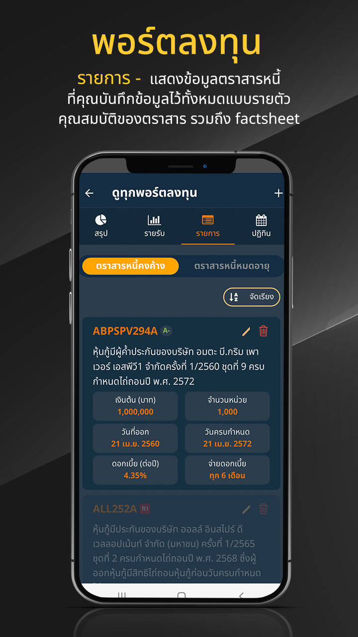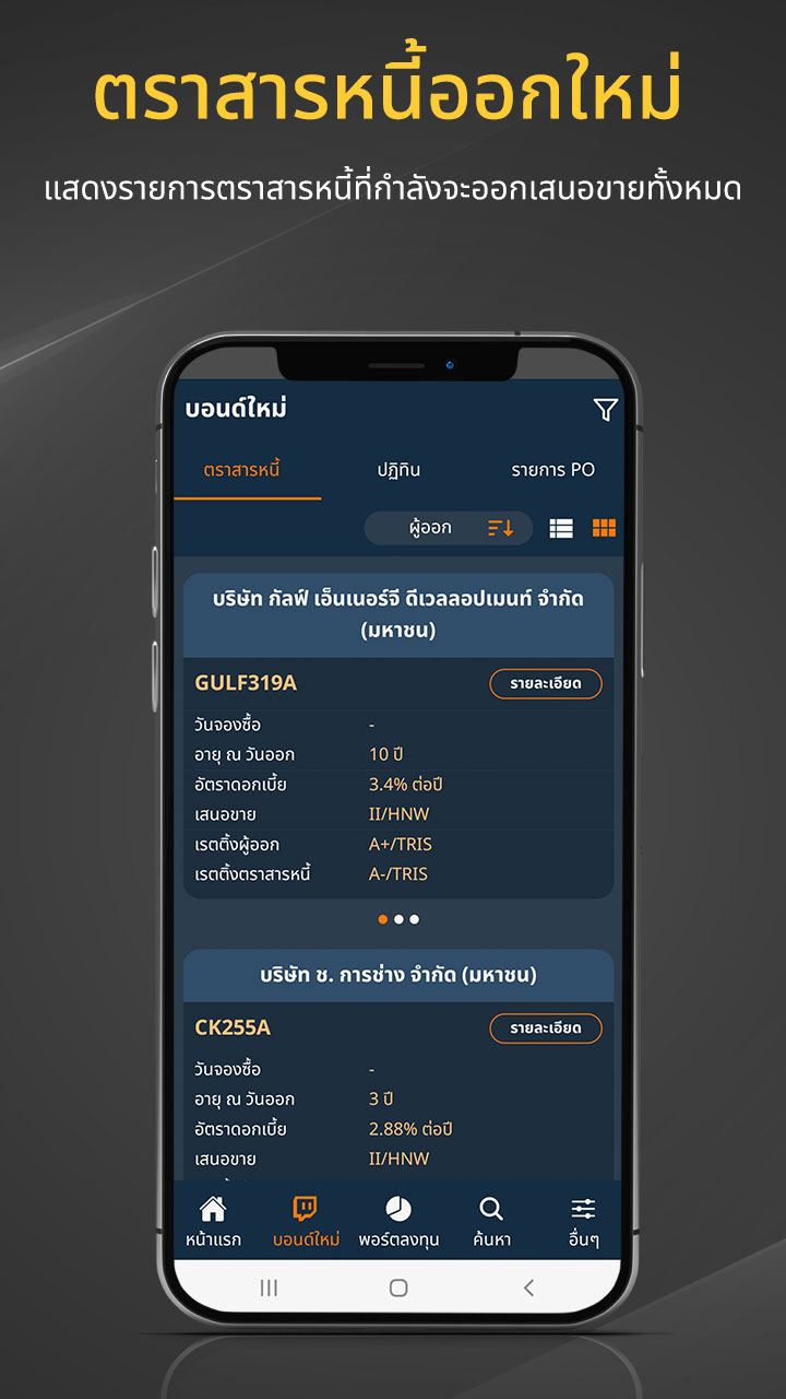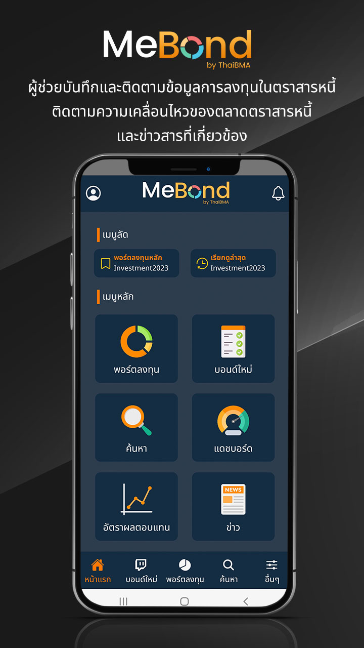 MeBond Mobile App MeBond Mobile App แอปพลิเคชันบนมือถือ ที่พัฒนาโดยสมาคมตลาดตราสารหนี้ไทย (ThaiBMA) เป็นตัวช่วยอำนวยความสะดวกในการ บันทึกตราสารหนี้ที่นักลงทุนถือครองไว้ที่เดียวกัน ช่วยให้นักลงทุนสามารถติดตามข้อมูลการลงทุนของตนเองและข้อมูลอื่นในตลาดตราสารหนี้ ให้เป็นไปอย่างสะดวกรวดเร็ว มีข้อมูลครบถ้วนในแหล่งเดียว เมนูหลัก ได้แก่ พอร์ตลงทุน ที่ทำให้คุณสามารถติดตามมูลค่าพอร์ทการลงทุน อายุเฉลี่ย และอัตราดอกเบี้ยเฉลี่ยของพอร์ท ในรูปแบบกราฟ ที่อ่านง่าย ตราสารหนี้ออกใหม่ ที่รวมข้อมูลตราสารหนี้ทั้งภาครัฐและเอกชน ที่กำลังเสนอขายอยู่ในตลาดแรก ให้นักลงทุนได้เลือกค้นหา และเปรียบเทียบข้อมูลที่สำคัญและจำเป็นต่อการตัดสินใจลงทุน ค้นหาตราสารหนี้ ช่วยในการค้นหาตราสารหนี้ในตลาดรองตามเงื่อนไขที่นักลงทุนสนใจ เส้นอัตราผลตอบแทนพันธบัตรรัฐบาล หรือ Yield curve ที่สะท้อนแนวโน้มและทิศทางของผลตอบแทนตราสารหนี้ตามรุ่นอายุต่างๆ Dashboard ที่แสดงสรุปภาพรวมตลาดตราสารหนี้ระหว่างวัน รวมถึง Fund flow ต่างชาติที่ดูได้แบบ Real-time MeBond Mobile App, developed by ThaiBMA, presents a fast and convenient access to bond investment information. By adding your own bond portfolio on the application, you can easily monitor movement of individual bonds in the port such as interest and principle payment, cash flows stream during the designated period, and portfolio maturity profile as well as related news. The app facilitates easy access to intraday information of the bond market such as yield curve and historical yield movement. You can also search for upcoming bond offering in the primary market and all bond information in the secondary market. Check out our video clips at your convenience and navigate the world of bond investment. สามารถดาวน์โหลด “MeBond by ThaiBMA App” ผ่าน iOS และ Android Download “MeBond by ThaiBMA” via iOS and Android iOS หรือ Search คำว่า Bond, MeBond รองรับเครื่องที่ติดตั้ง iOS Version 10 ขึ้นไป Android หรือ Search คำว่า Bond, MeBond รองรับเครื่องที่ติดตั้ง Android Version 4.4 ขึ้นไป คู่มือการติดตั้ง/คู่มือการใช้งาน คู่มือการใช้งาน MeBond App. Highlight with “MeBond by ThaiBMA” MeBond by ThaiBMA Version ใหม่มาพร้อมกับการพัฒนาอย่างรอบด้านทั้ง 4S การโอนถ่ายข้อมูลพอร์ตลงทุนไปสู่ MeBond เวอร์ชันใหม่ สำหรับ iOs กรณีลง MeBond คนละอุปกรณ์กัน การโอนถ่ายข้อมูลพอร์ตลงทุนไปสู่ MeBond เวอร์ชันใหม่ สำหรับ iOs กรณีลง MeBond ในอุปกรณ์เดียวกัน การโอนถ่ายข้อมูลพอร์ตลงทุนไปสู่ MeBond เวอร์ชันใหม่ สำหรับระบบปฎิบัติการ Android Mebond ผู้ช่วยบันทึกและติดตามข้อมูลการลงทุนในตราสารหนี้ และติดตามความเคลื่อนไหวของตลาดตราสารหนี้และข่าวสารที่เกี่ยวข้อง MeBond กับฟังก์ชันการค้นหาข้อมูลตราสารหนี้ทั้งตลาดแรกและตลาดรอง (เมนู ตราสารหนี้ออกใหม่ และ ค้นหาตราสารหนี้) MeBond กับการดูข้อมูลภาพรวมตลาดตราสารหนี้ระหว่างวัน (เมนู อัตราผลตอบแทน และ Dashbaord) การตั้งค่าต่างๆ ใน MeBond (เมนูข่าว และ ตั้งค่า) Menu > Port Menu > New Issue Menu > Search Menu > Yield Curve Menu > News Light Version