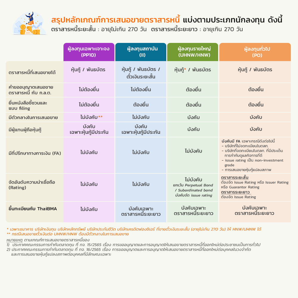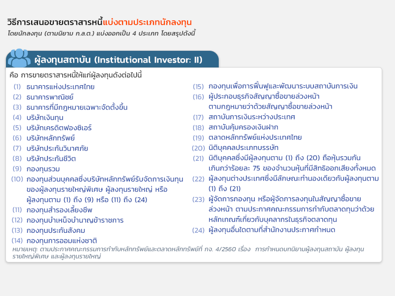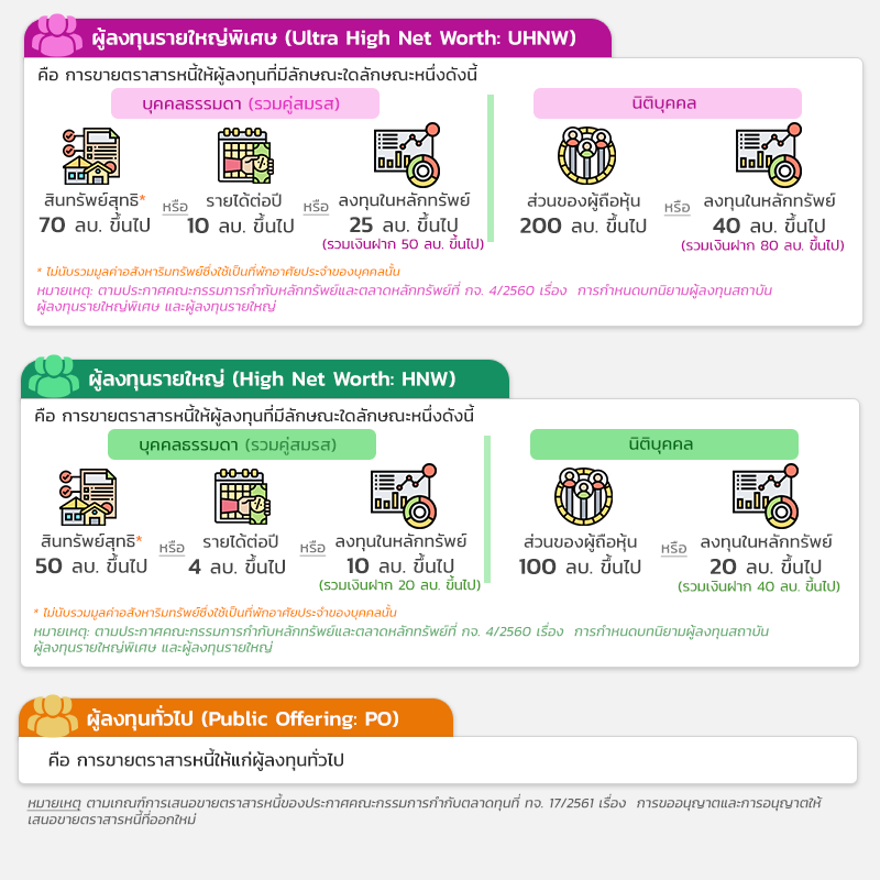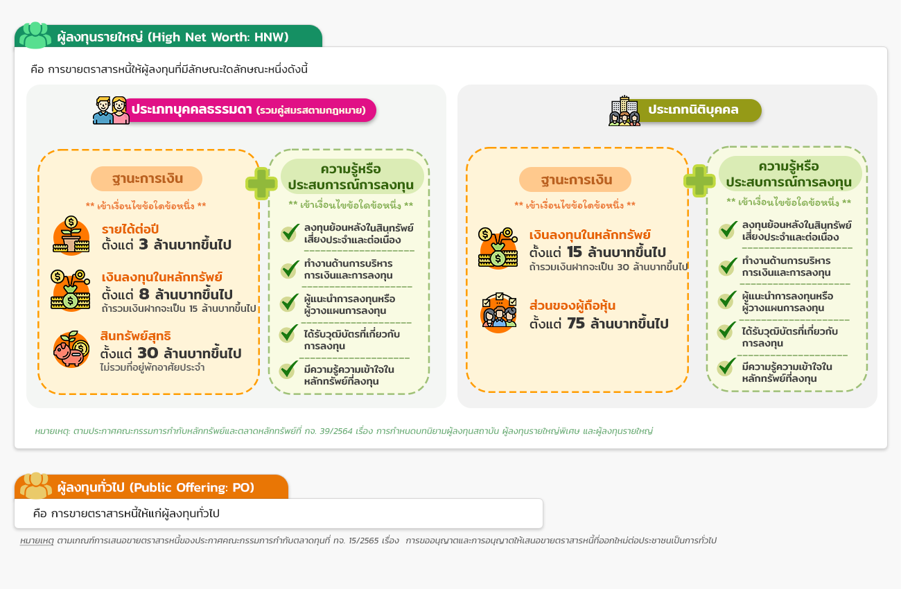 หลักเกณฑ์และขั้นตอนการเสนอขายหุ้นกู้ (Plain bonds) / ตั๋วเงิน 1.ประเภทการเสนอขายแบ่งตามกลุ่มนักลงทุน นิยามผู้ลงทุนเก่าตามประกาศ กจ. 4/2560 นิยามผู้ลงทุนใหม่ตามประกาศ กจ. 39/2564 (เริ่มมีผลบังคับใช้ 1 ตุลาคม 2565) 2.คุณสมบัติของผู้ออกตราสารหนี้ 3.สรุปหลักเกณฑ์และขั้นตอนการเสนอขายตราสารหนี้ 3.1 ผู้ลงทุนเฉพาะเจาะจง (Private Placement : PP10) 3.2 ผู้ลงทุนสถาบัน (Institutional Investor : II) 3.3 ผู้ลงทุนรายใหญ่พิเศษ (Ultra High Net Worth : UHNW) 3.4 ผู้ลงทุนรายใหญ่ (High Net Worth : HNW) 3.5 ผู้ลงทุนทั่วไป (Public Offering : PO) Back to Home