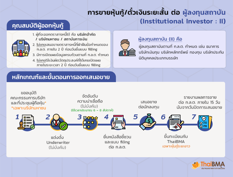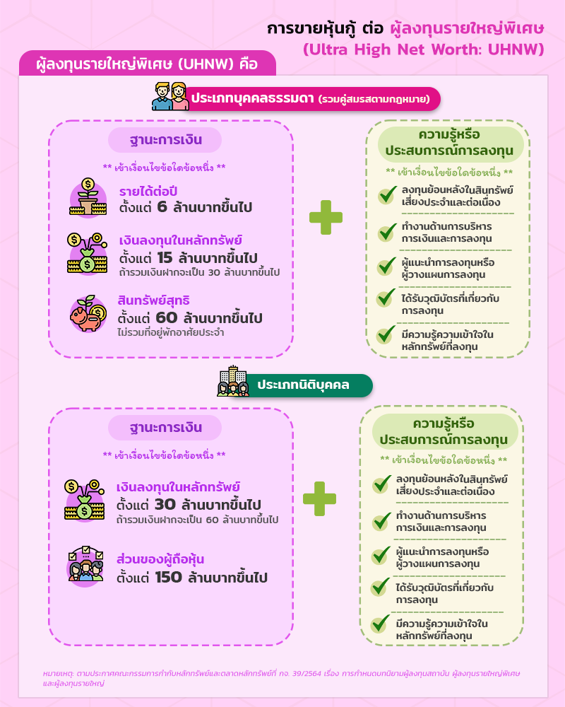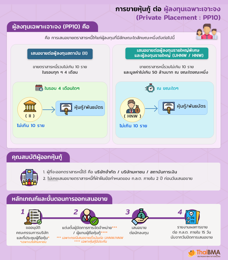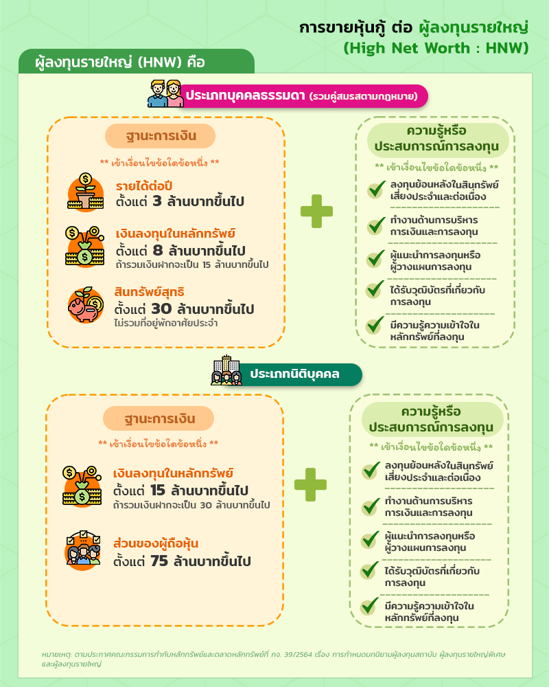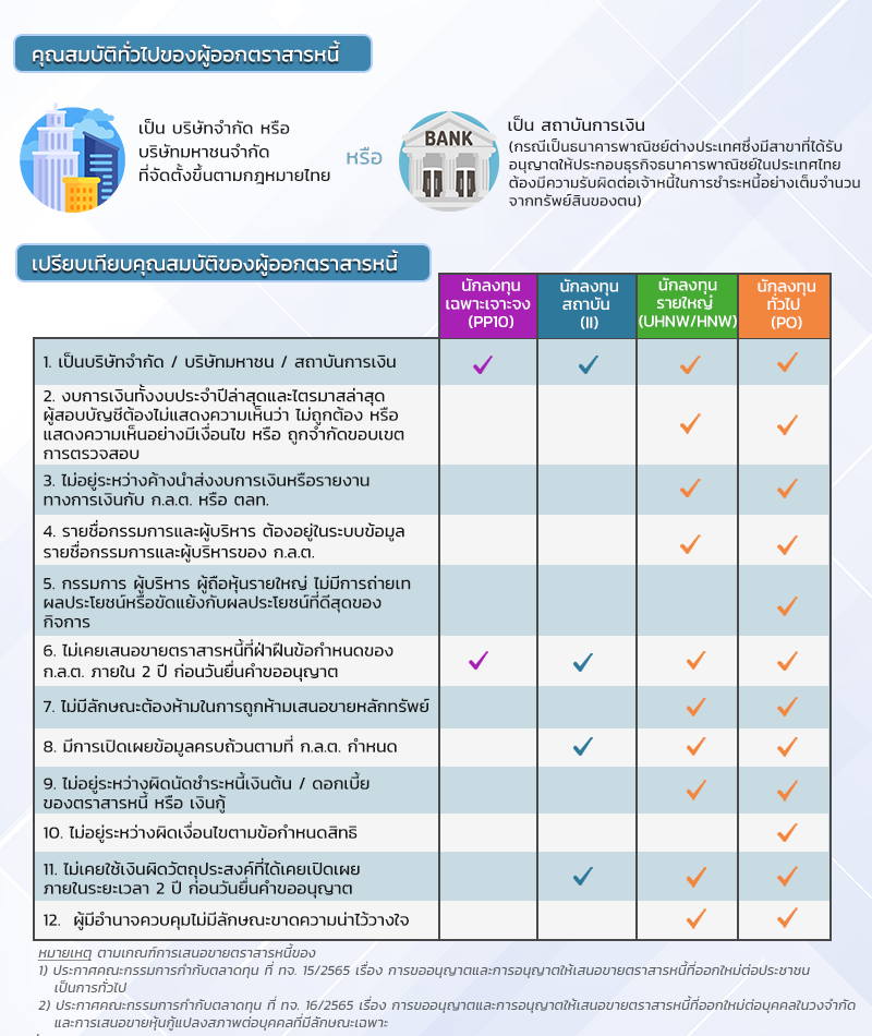 หลักเกณฑ์และขั้นตอนการเสนอขายหุ้นกู้ (Plain bonds) / ตั๋วเงิน 1.ประเภทการเสนอขายแบ่งตามกลุ่มนักลงทุน นิยามผู้ลงทุนเก่าตามประกาศ กจ. 4/2560 นิยามผู้ลงทุนใหม่ตามประกาศ กจ. 39/2564 (เริ่มมีผลบังคับใช้ 1 ตุลาคม 2565) 2.คุณสมบัติของผู้ออกตราสารหนี้ 3.สรุปหลักเกณฑ์และขั้นตอนการเสนอขายตราสารหนี้ 3.1 ผู้ลงทุนเฉพาะเจาะจง (Private Placement : PP10) 3.2 ผู้ลงทุนสถาบัน (Institutional Investor : II) 3.3 ผู้ลงทุนรายใหญ่พิเศษ (Ultra High Net Worth : UHNW) 3.4 ผู้ลงทุนรายใหญ่ (High Net Worth : HNW) 3.5 ผู้ลงทุนทั่วไป (Public Offering : PO) Back to Home