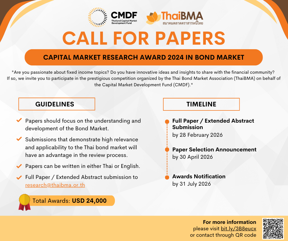 The Thai Bond Market Association (ThaiBMA), in collaboration with the Capital Market Development Fund (CMDF), is delighted to invite researchers to participate in the Capital Market Research Award, with a specific focus on bond markets. This initiative aims to encourage and support research that advances knowledge and contributes to the growth of the bond market. Researchers interested in this field are encouraged to submit their papers for consideration. Please see the details provided below for further information.